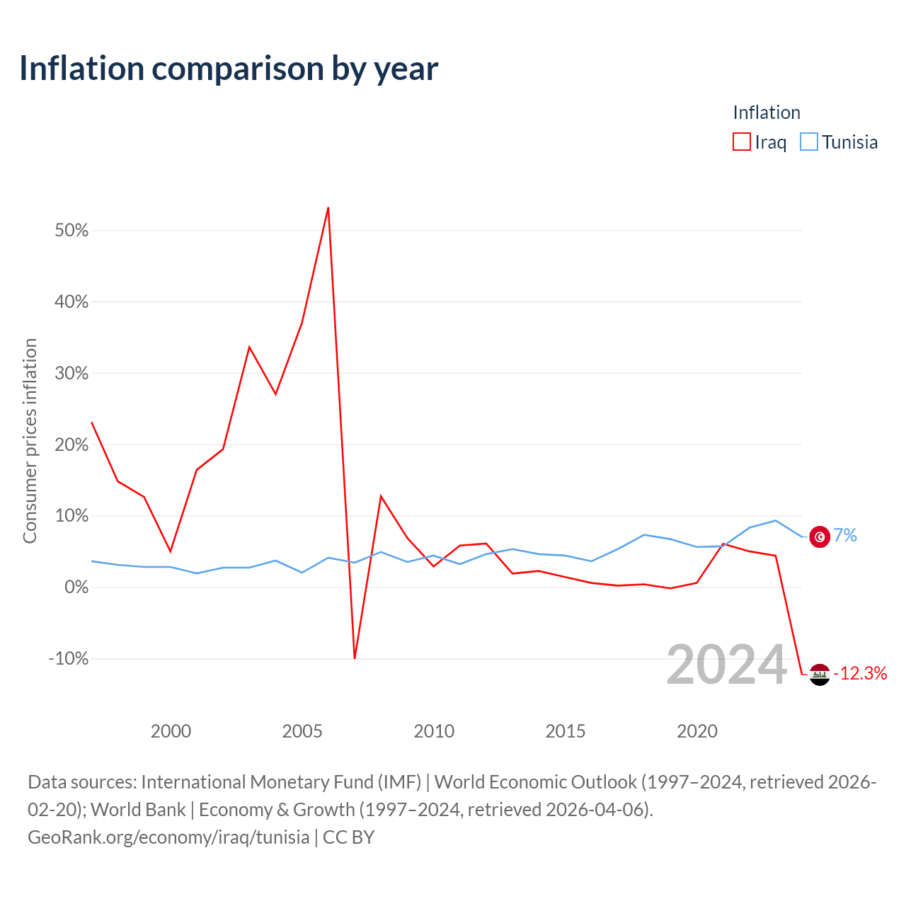 Iraq has a GDP of $280B compared to $51.3B for Tunisia, ranking 50/197 and 93/197 by economy size, respectively.
