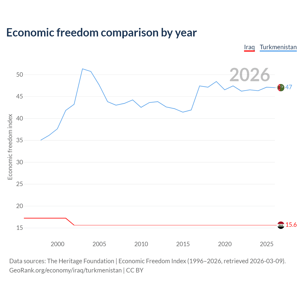 The Economic Freedom Index for Iraq is 15.6, ranking 196/197, compared to 47 for Turkmenistan, ranking 177/197. The chart above displays a comparison of annual changes in economic freedom indexes.