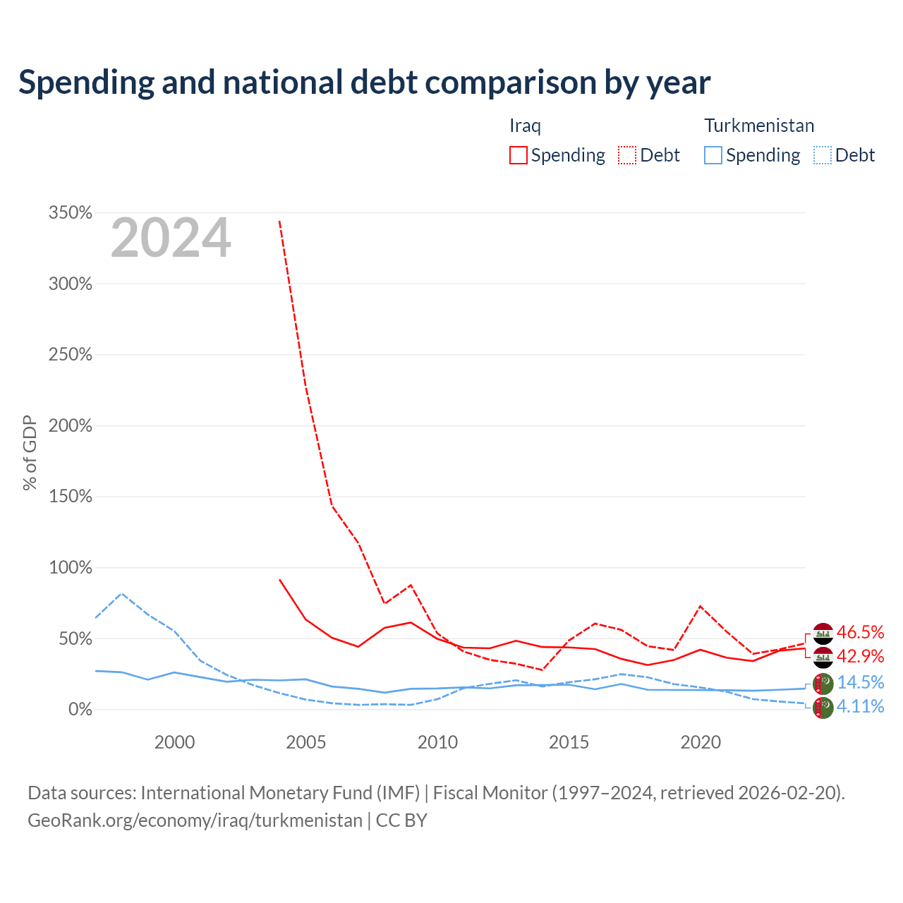 Iraq has $130B in government debt (46.5% of GDP), compared to $2.11B (4.11% of GDP) in Turkmenistan.