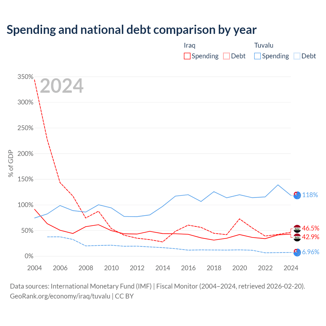 Iraq has $130B in government debt (46.5% of GDP), compared to $4.15M (6.96% of GDP) in Tuvalu.