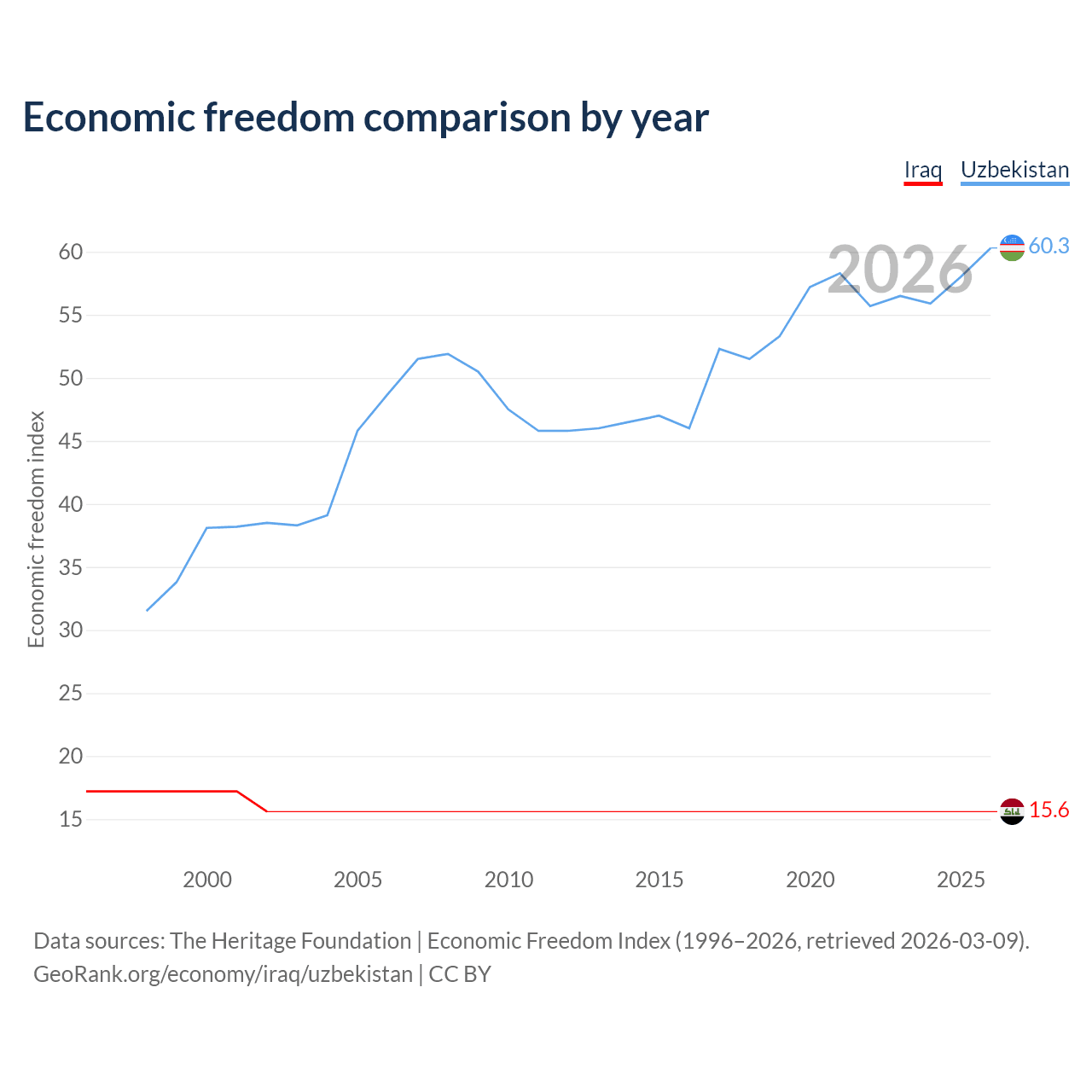 The Economic Freedom Index for Iraq is 15.6, ranking 196/197, compared to 60.3 for Uzbekistan, ranking 94/197. The chart above displays a comparison of annual changes in economic freedom indexes.