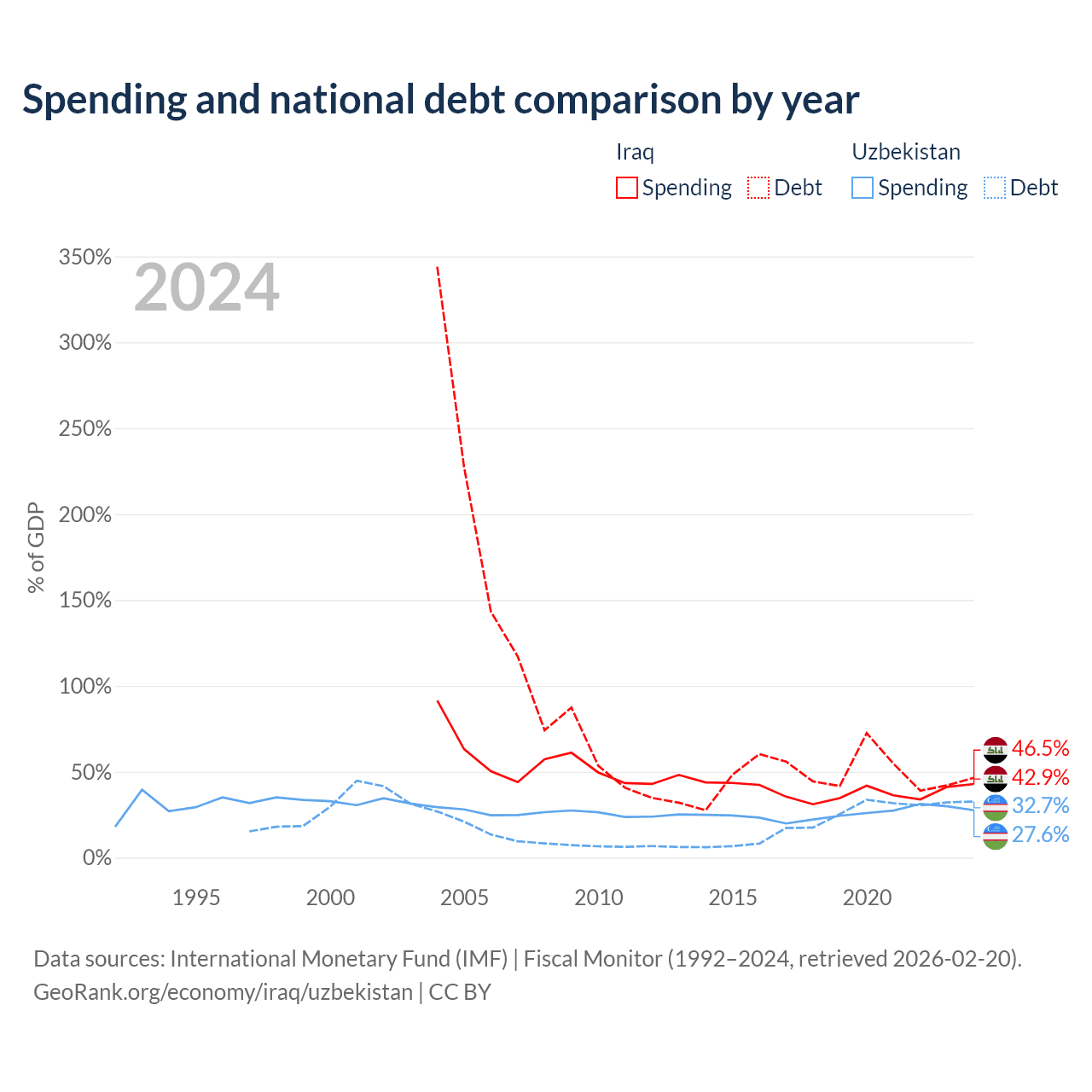 Iraq has $130B in government debt (46.5% of GDP), compared to $37.5B (32.7% of GDP) in Uzbekistan.