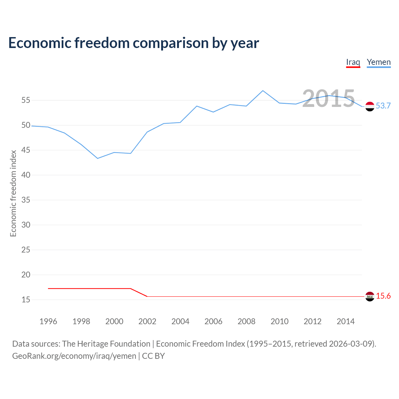 The Economic Freedom Index for Iraq is 15.6, ranking 196/197, compared to 53.7 for Yemen, ranking 138/197. The chart above displays a comparison of annual changes in economic freedom indexes.