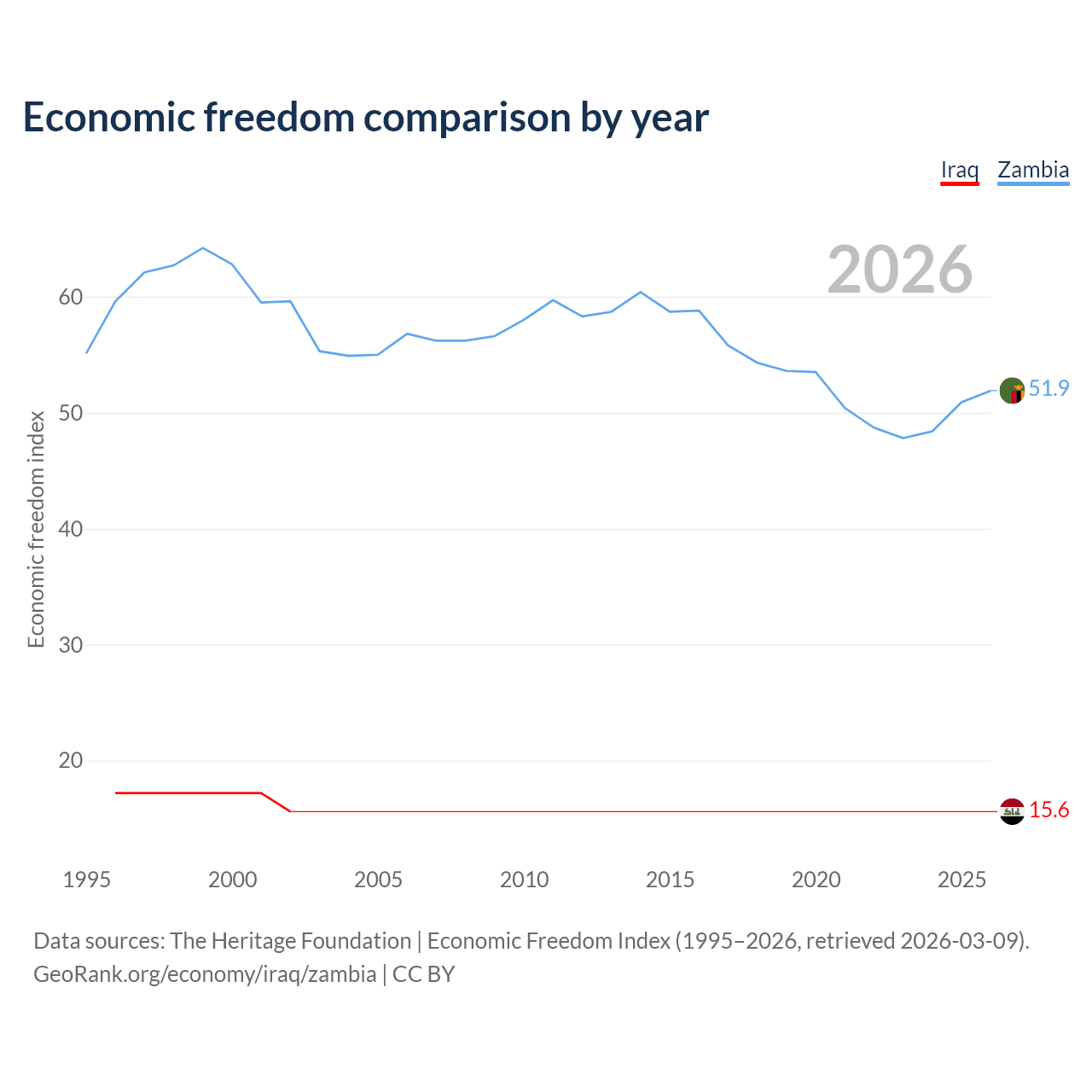 The Economic Freedom Index for Iraq is 15.6, ranking 196/197, compared to 51.9 for Zambia, ranking 152/197. The chart above displays a comparison of annual changes in economic freedom indexes.