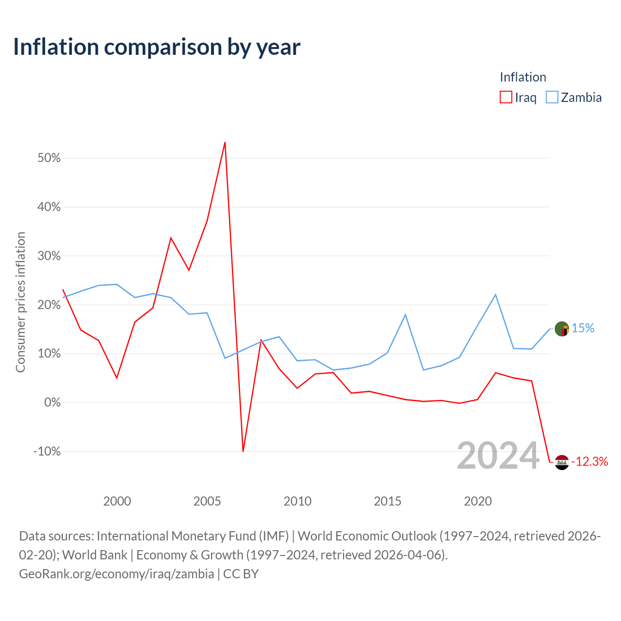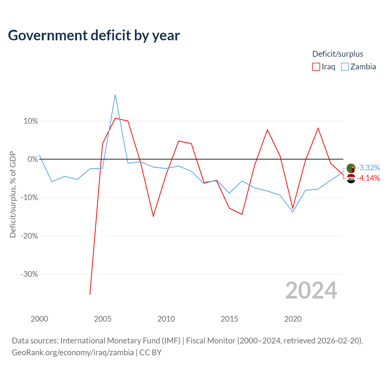 Iraq has a GDP of $280B compared to $25.3B for Zambia, ranking 50/197 and 116/197 by economy size, respectively.