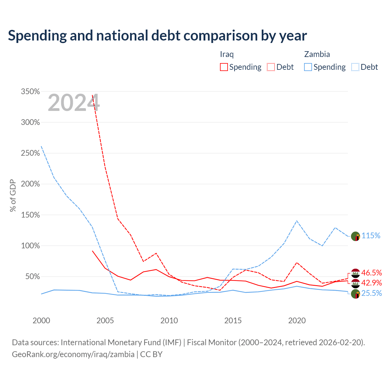 Iraq has $130B in government debt (46.5% of GDP), compared to $29.1B (114.9% of GDP) in Zambia.