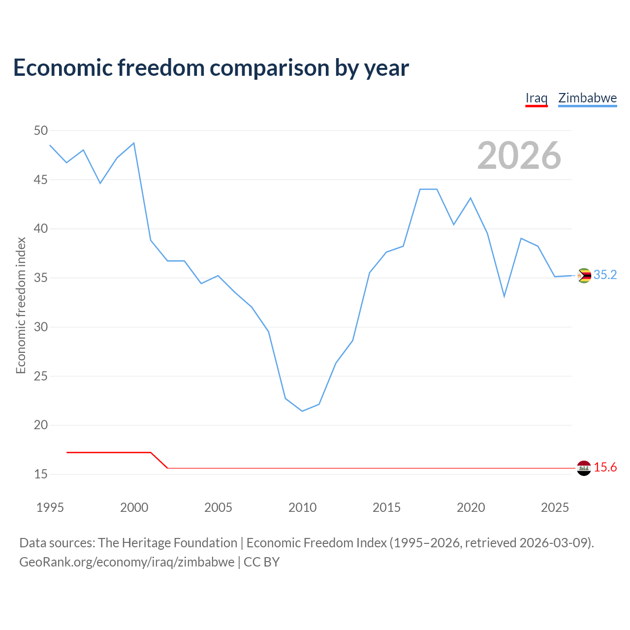 The Economic Freedom Index for Iraq is 15.6, ranking 196/197, compared to 35.2 for Zimbabwe, ranking 190/197. The chart above displays a comparison of annual changes in economic freedom indexes.