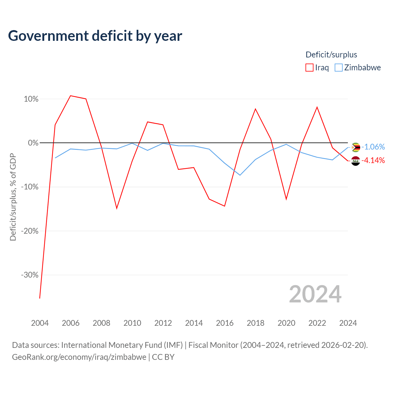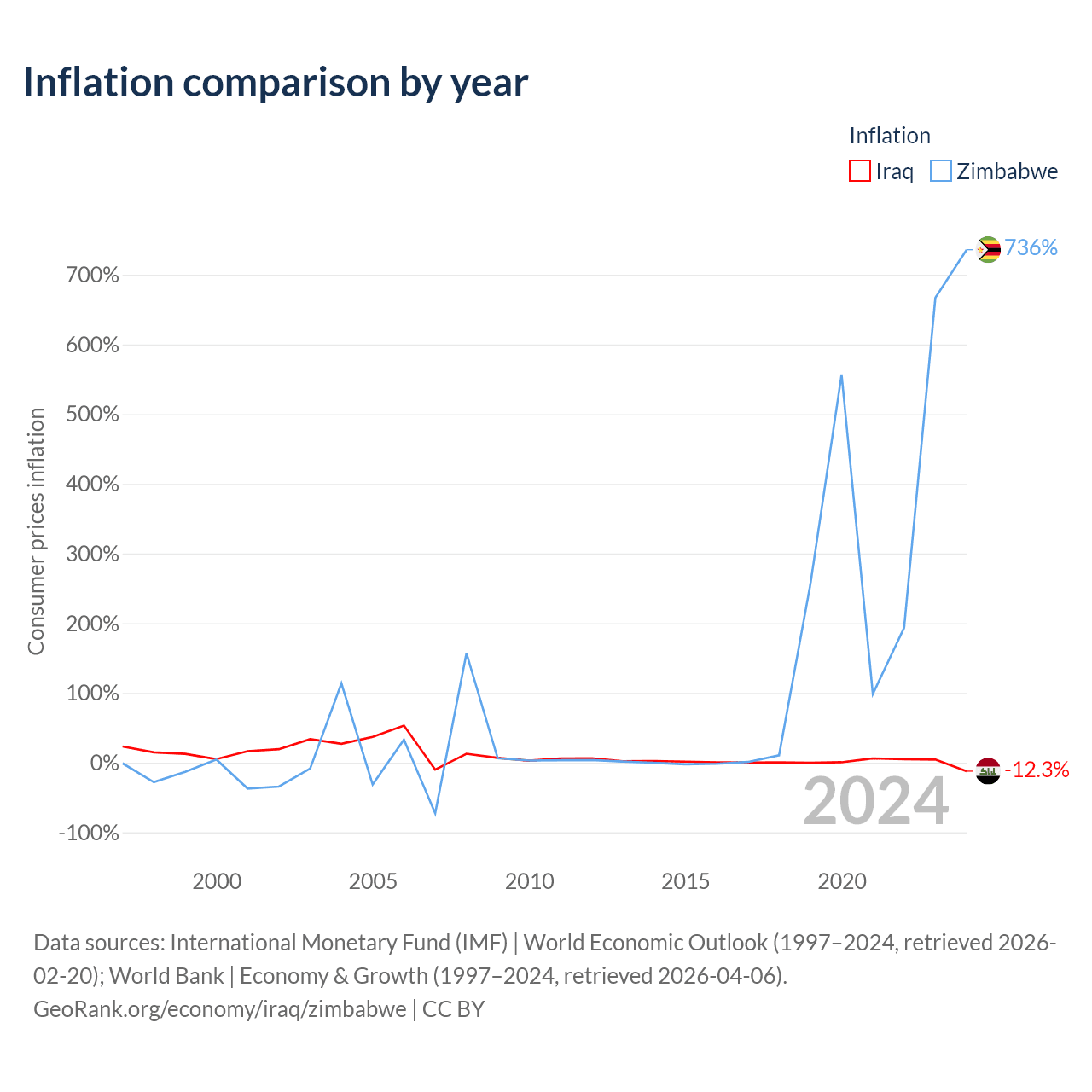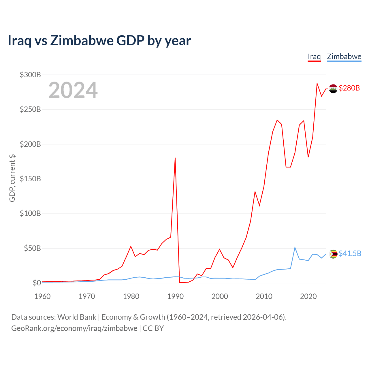 Iraq has a GDP of $280B compared to $41.5B for Zimbabwe, ranking 50/197 and 102/197 by economy size, respectively.