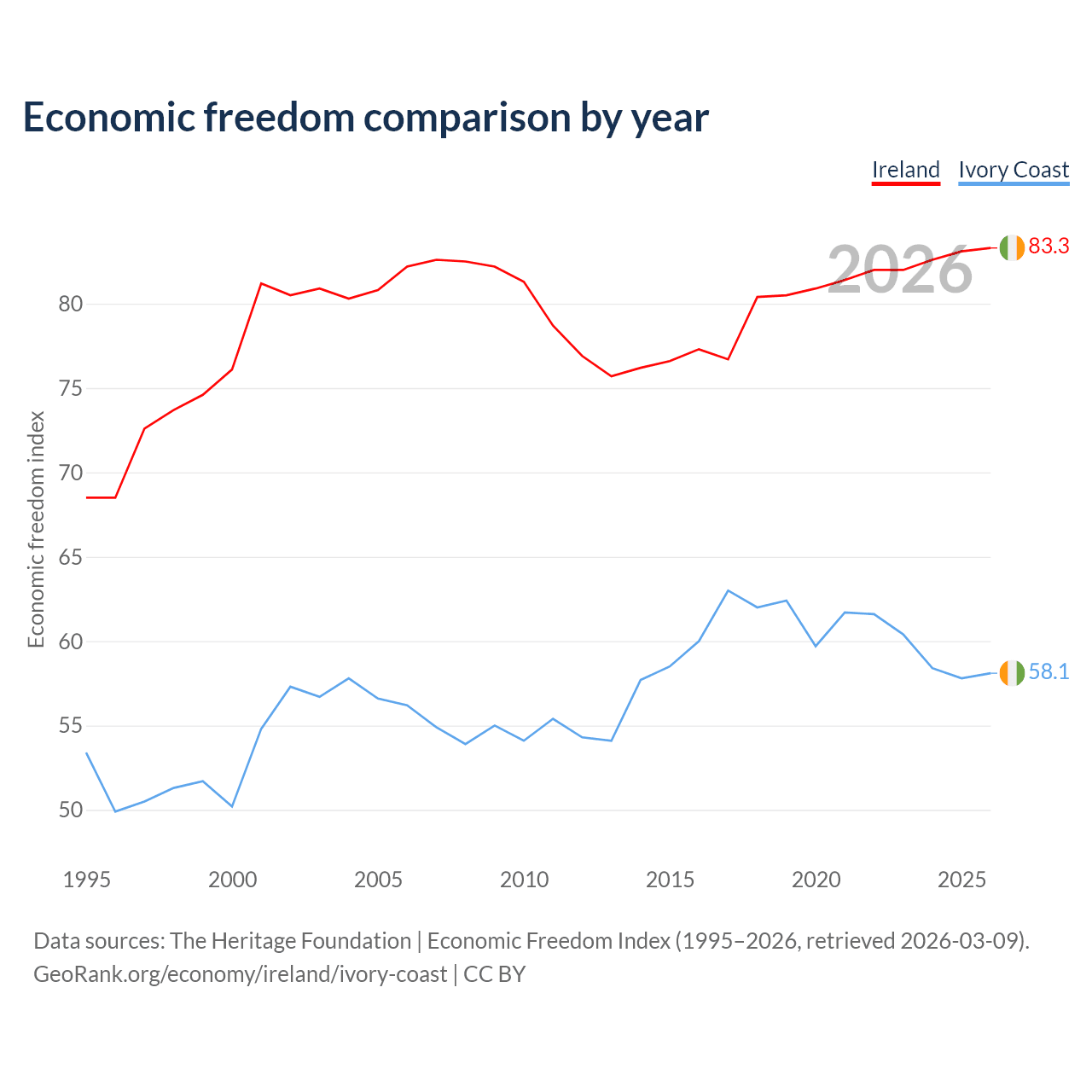 The Economic Freedom Index for Ireland is 83.3, ranking 3/197, compared to 58.1 for Ivory Coast, ranking 111/197. The chart above displays a comparison of annual changes in economic freedom indexes.