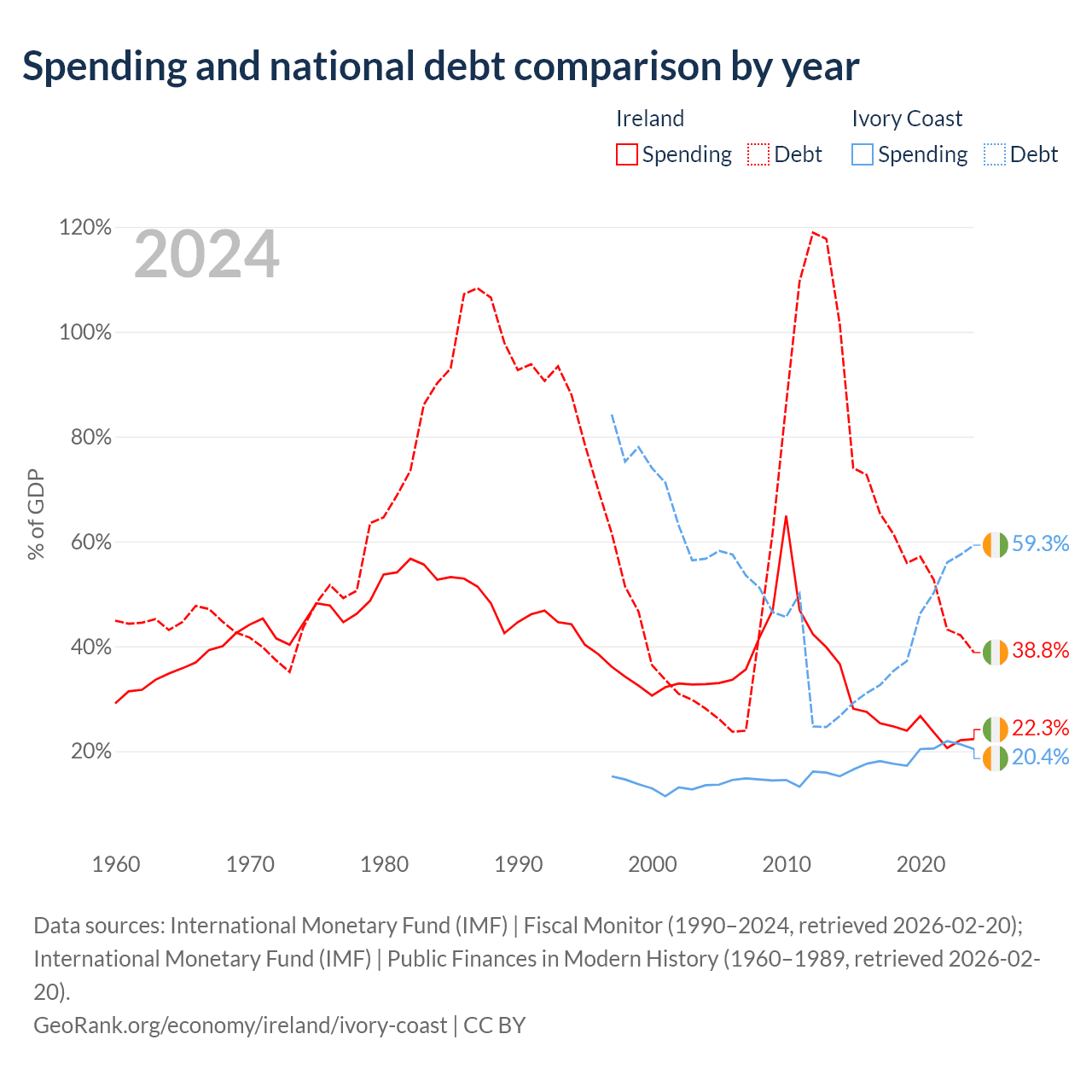 Ireland has $236B in government debt (38.8% of GDP), compared to $51.6B (59.3% of GDP) in Ivory Coast.