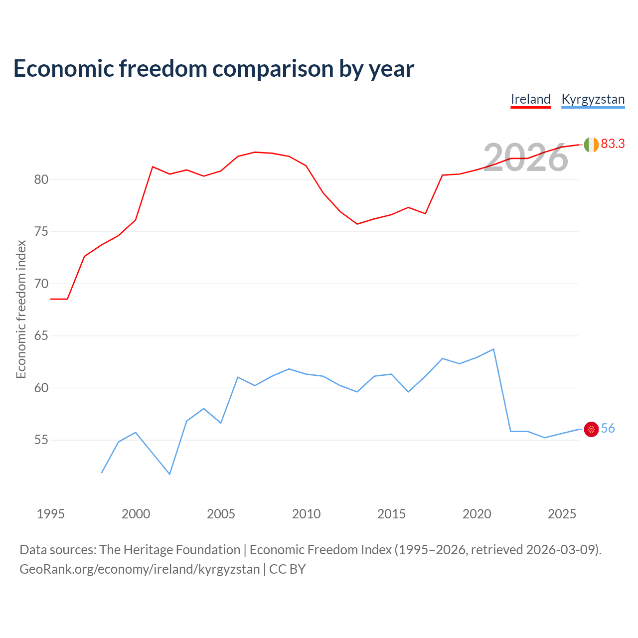 The Economic Freedom Index for Ireland is 83.3, ranking 3/197, compared to 56 for Kyrgyzstan, ranking 126/197. The chart above displays a comparison of annual changes in economic freedom indexes.