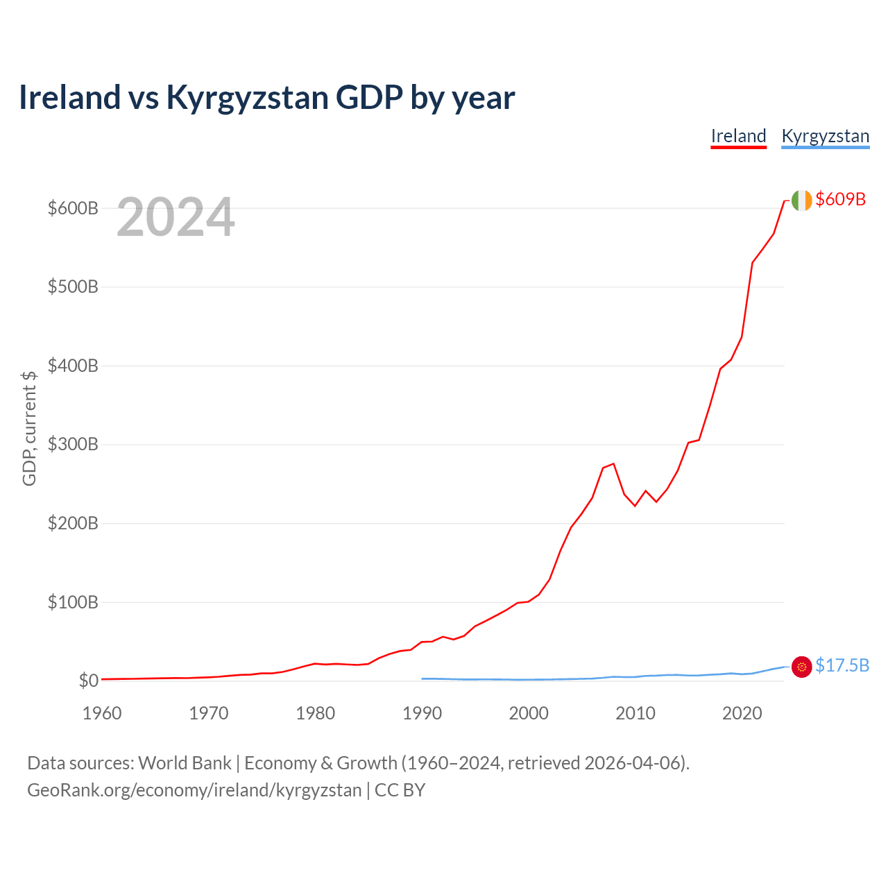 Ireland has a GDP of $609B compared to $17.5B for Kyrgyzstan, ranking 25/197 and 135/197 by economy size, respectively.