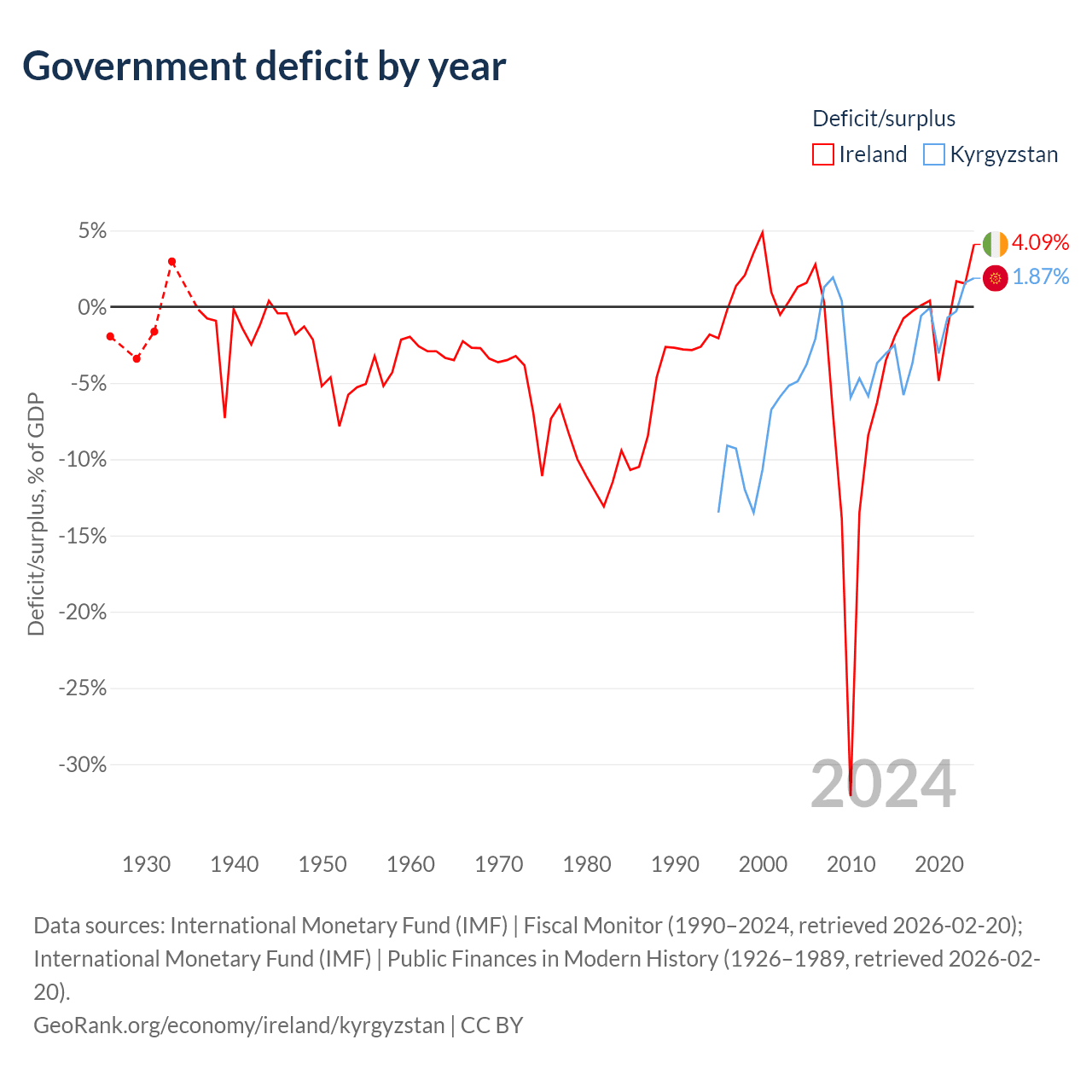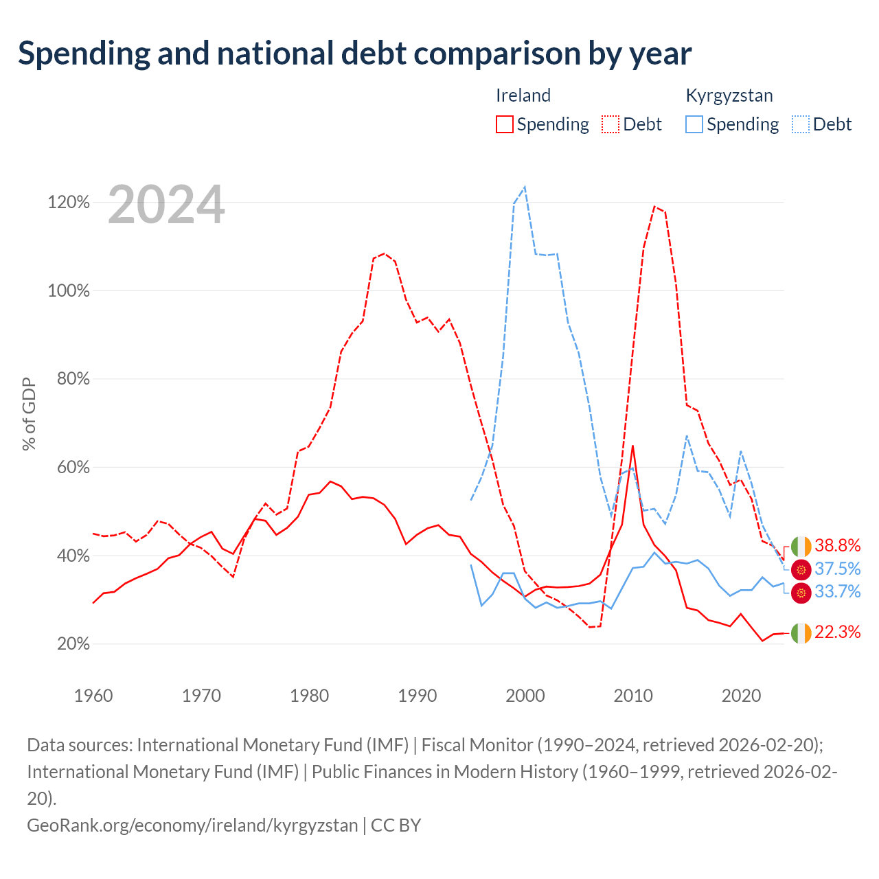 Ireland has $236B in government debt (38.8% of GDP), compared to $6.56B (37.5% of GDP) in Kyrgyzstan.