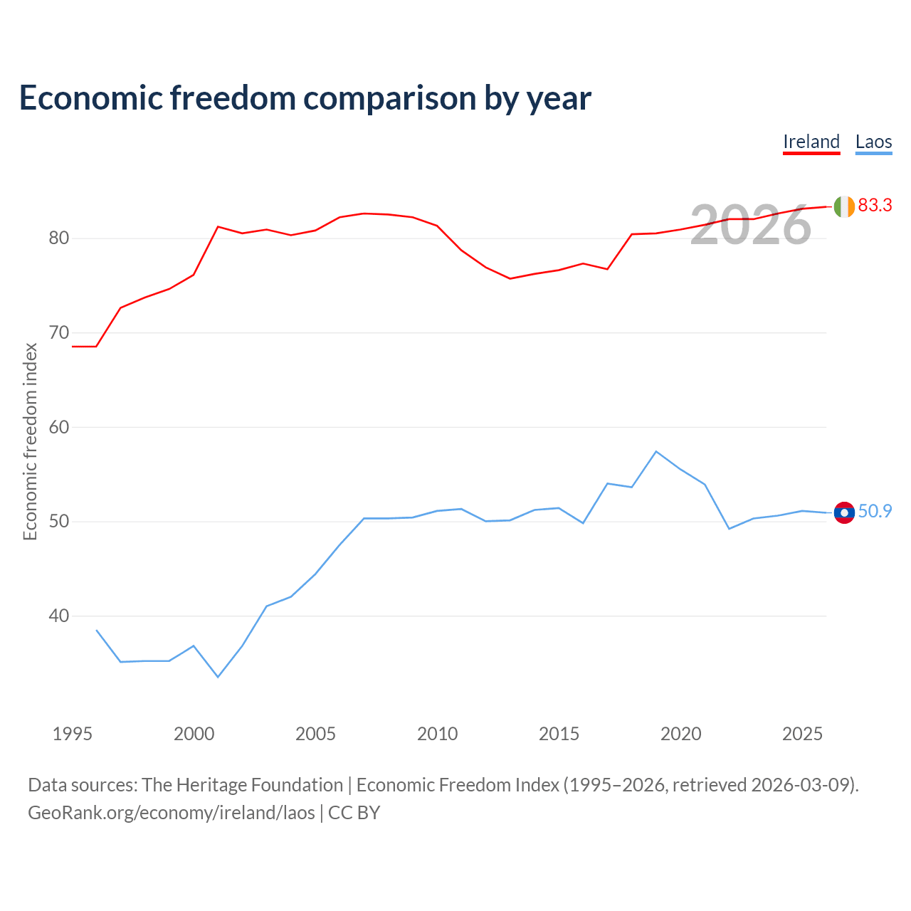 The Economic Freedom Index for Ireland is 83.3, ranking 3/197, compared to 50.9 for Laos, ranking 157/197. The chart above displays a comparison of annual changes in economic freedom indexes.
