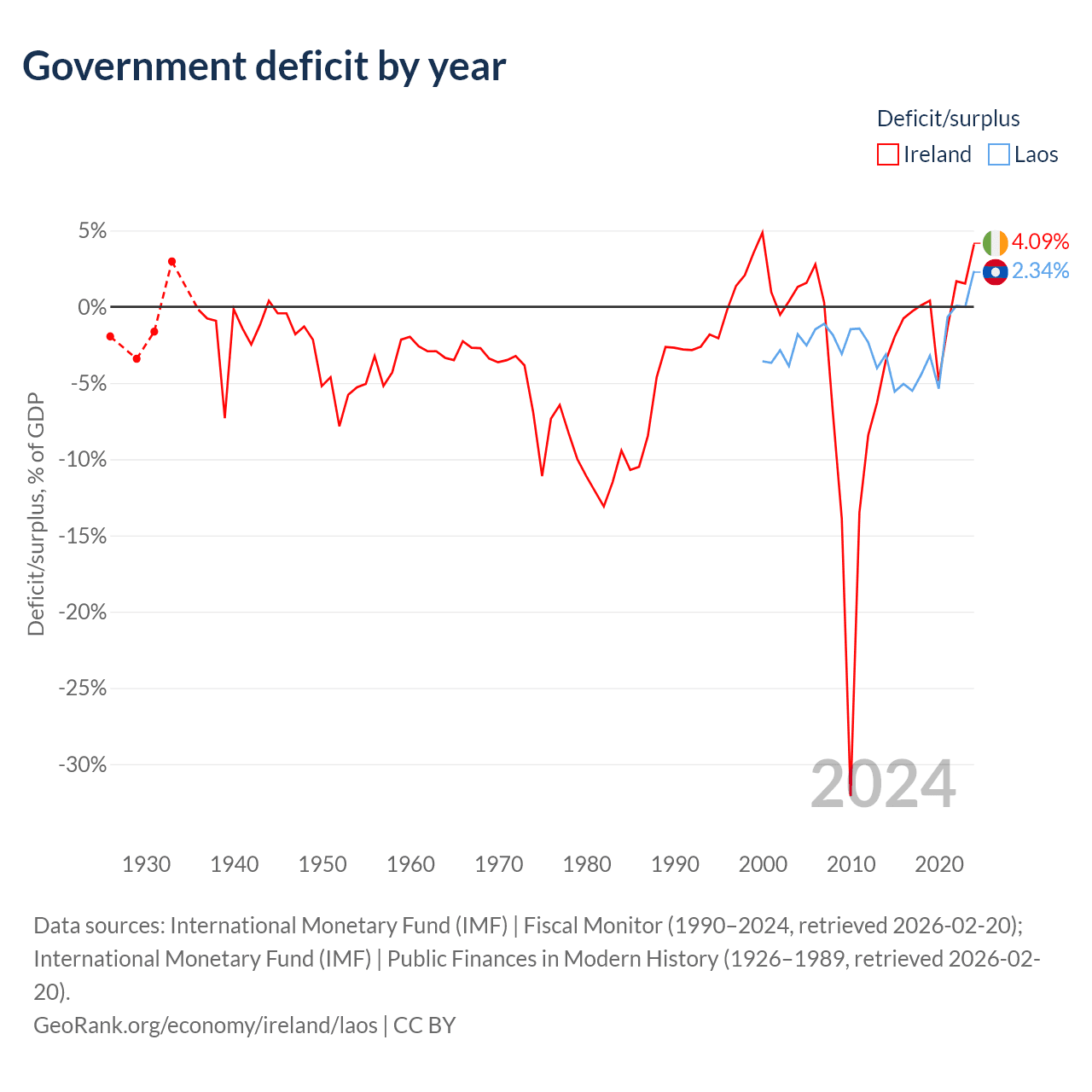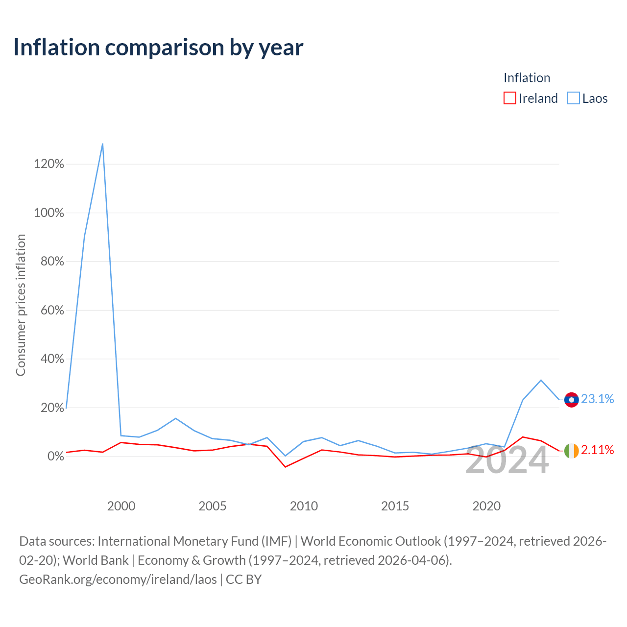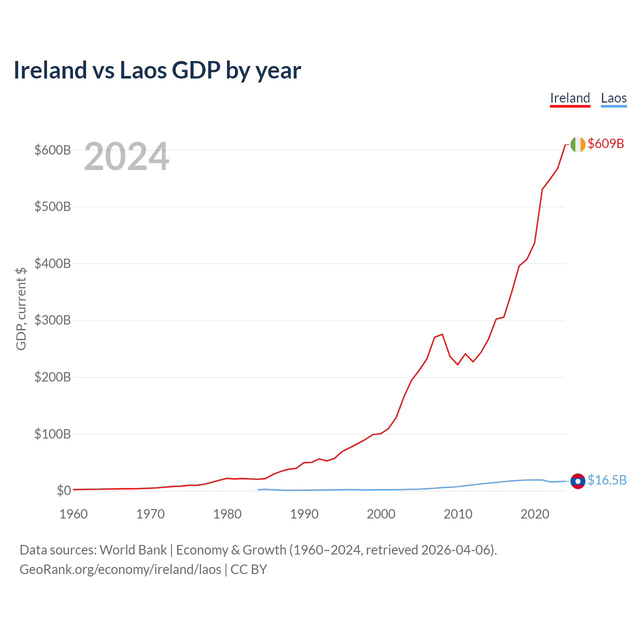 Ireland has a GDP of $609B compared to $16.5B for Laos, ranking 25/197 and 139/197 by economy size, respectively.