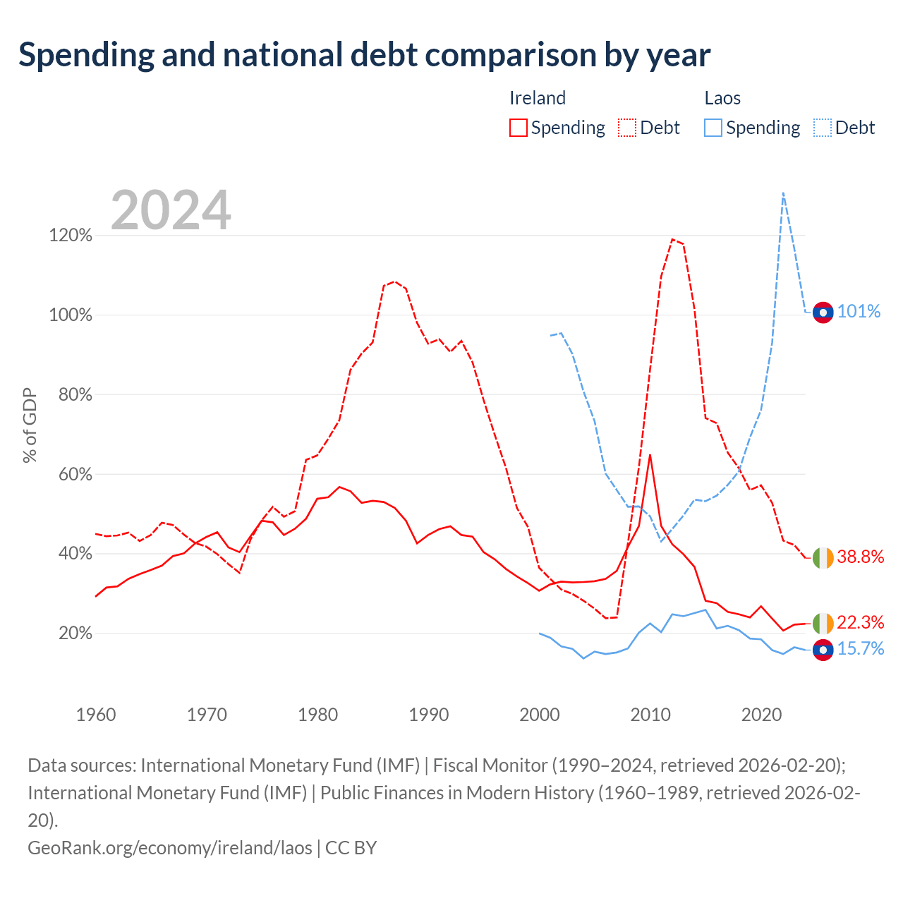 Ireland has $236B in government debt (38.8% of GDP), compared to $16.6B (100.5% of GDP) in Laos.