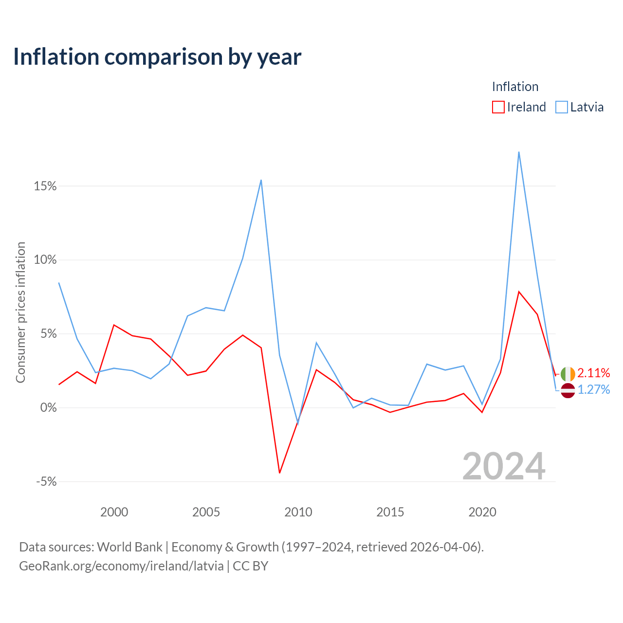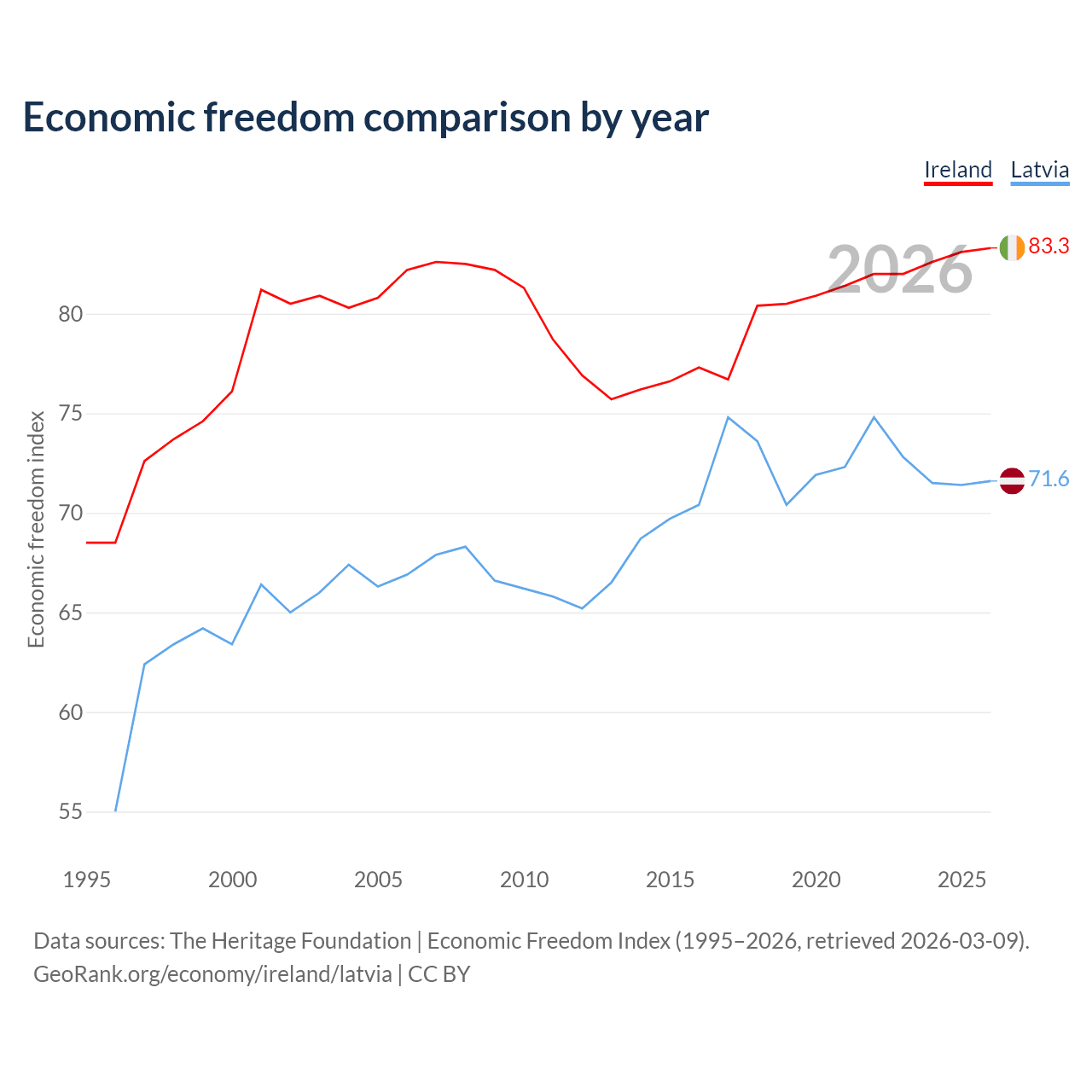The Economic Freedom Index for Ireland is 83.3, ranking 3/197, compared to 71.6 for Latvia, ranking 31/197. The chart above displays a comparison of annual changes in economic freedom indexes.