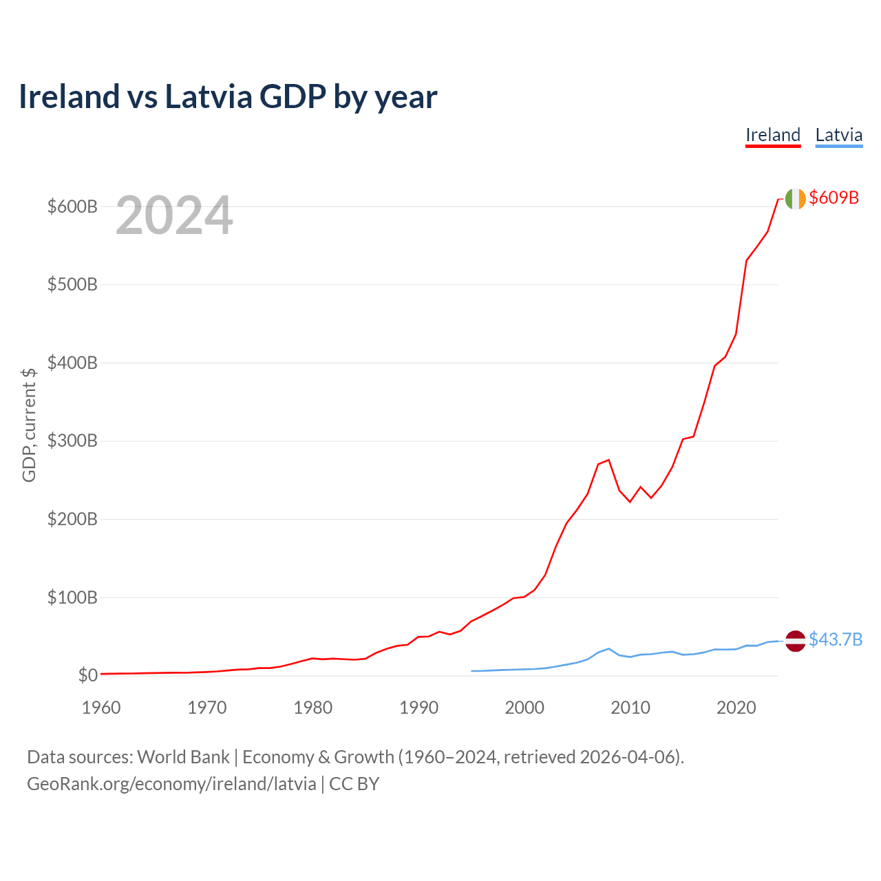 Ireland has a GDP of $609B compared to $43.7B for Latvia, ranking 25/197 and 99/197 by economy size, respectively.