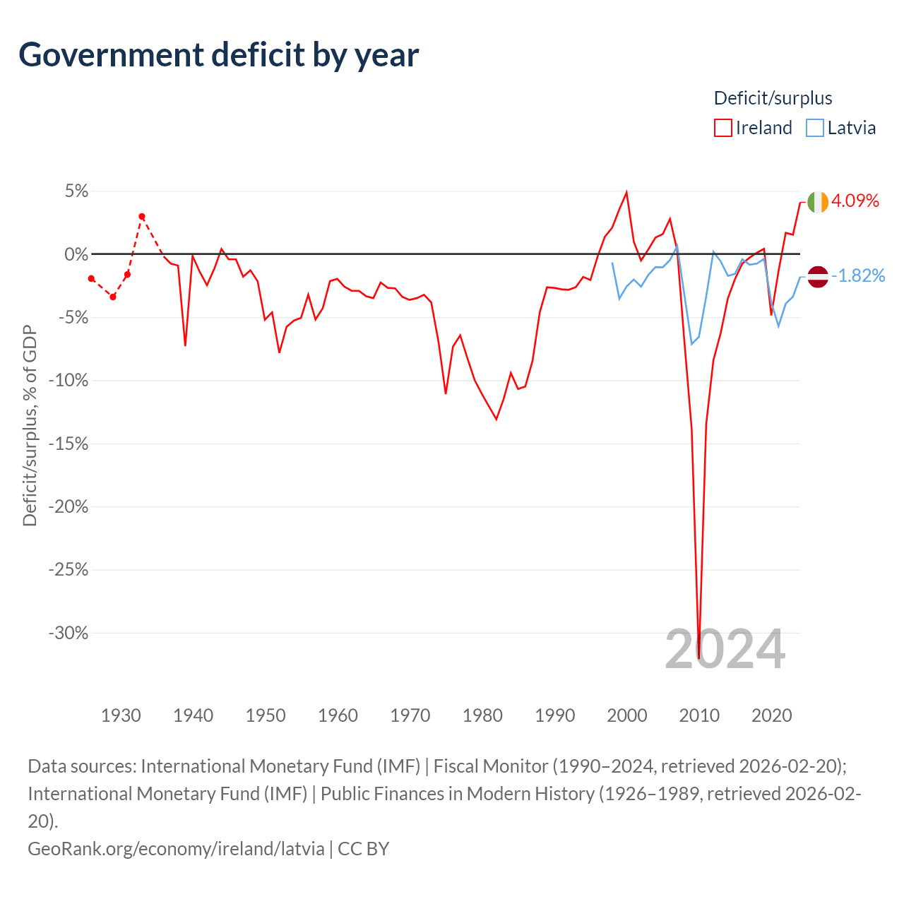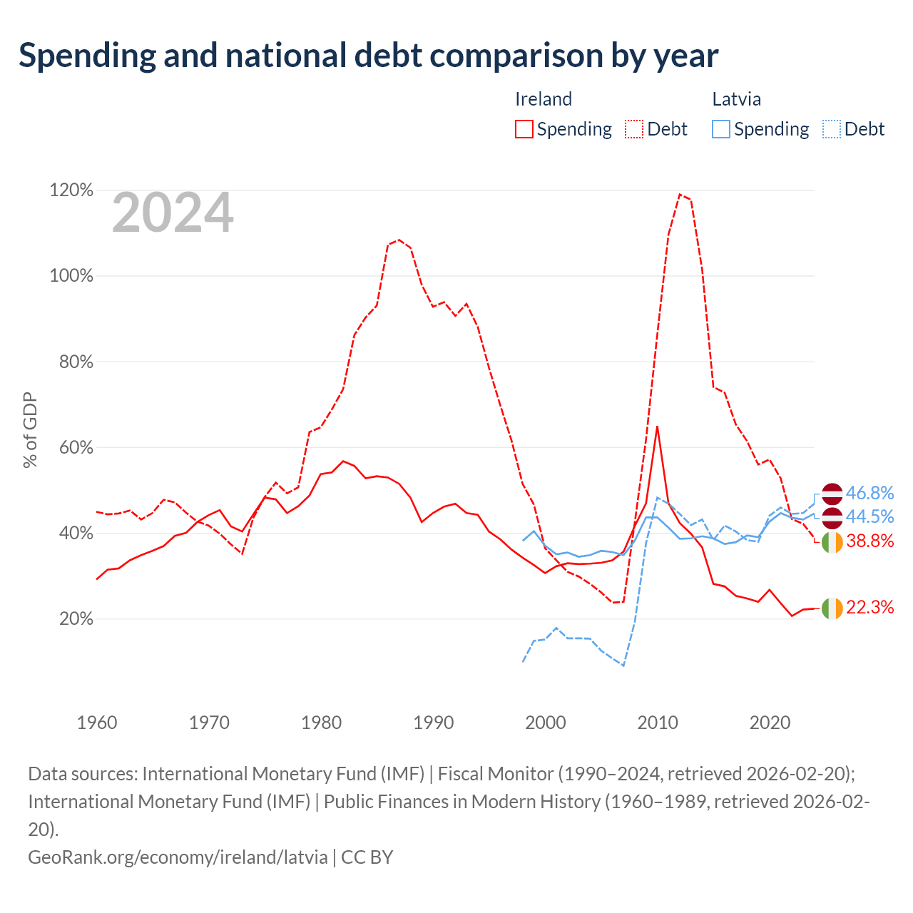 Ireland has $236B in government debt (38.8% of GDP), compared to $20.4B (46.8% of GDP) in Latvia.
