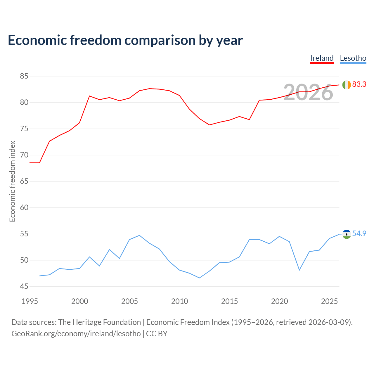The Economic Freedom Index for Ireland is 83.3, ranking 3/197, compared to 54.9 for Lesotho, ranking 130/197. The chart above displays a comparison of annual changes in economic freedom indexes.