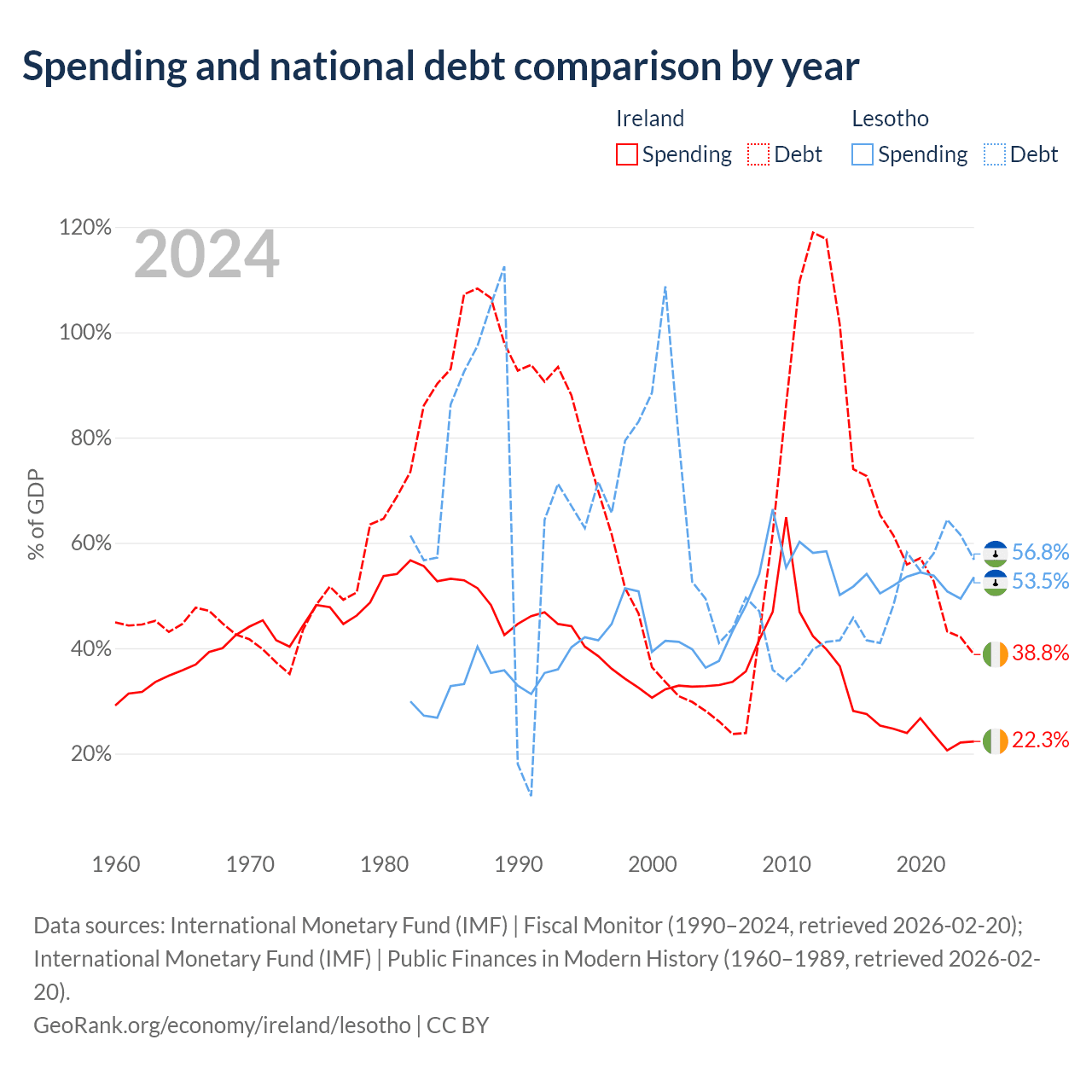 Ireland has $236B in government debt (38.8% of GDP), compared to $1.29B (56.8% of GDP) in Lesotho.