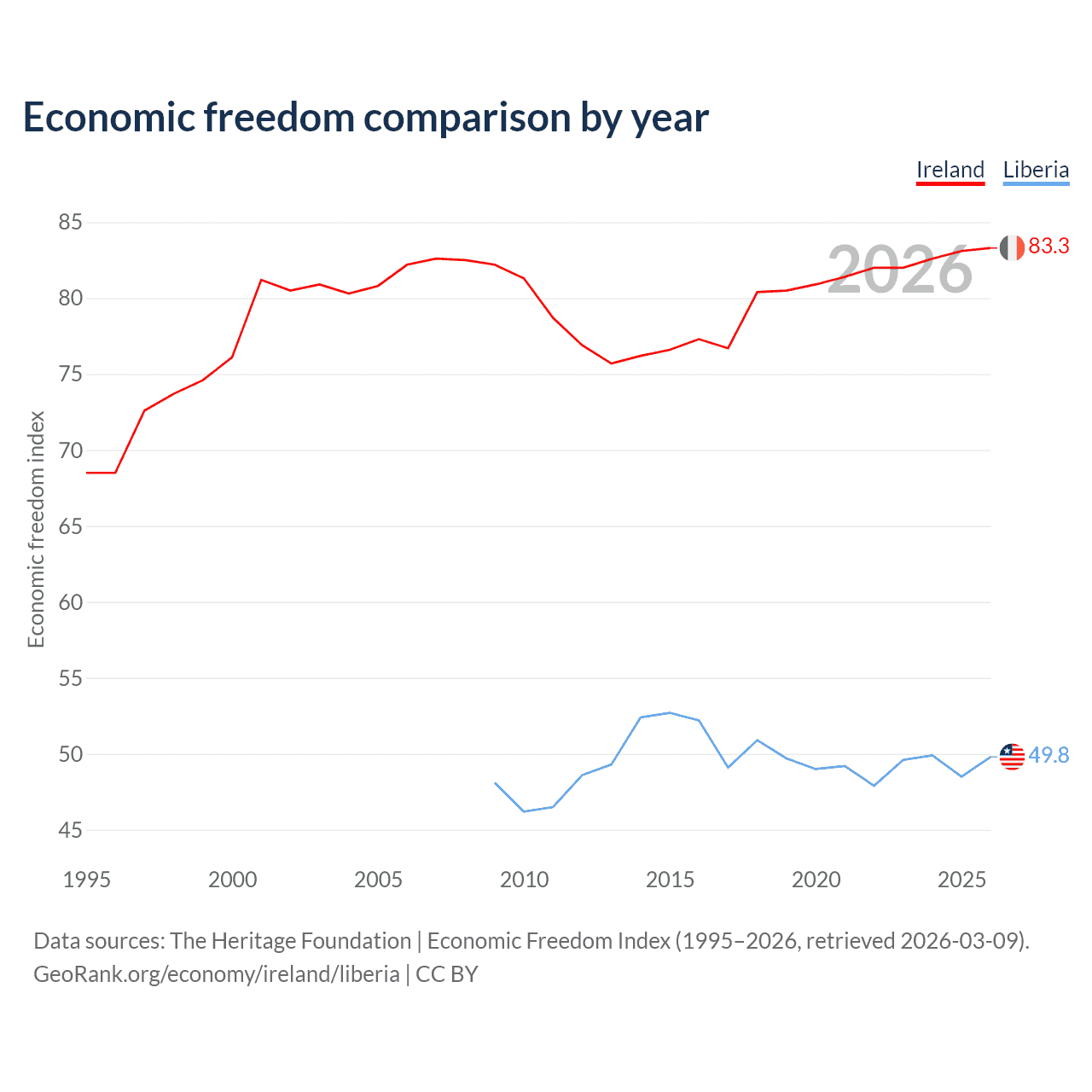 The Economic Freedom Index for Ireland is 83.3, ranking 3/197, compared to 49.8 for Liberia, ranking 163/197. The chart above displays a comparison of annual changes in economic freedom indexes.