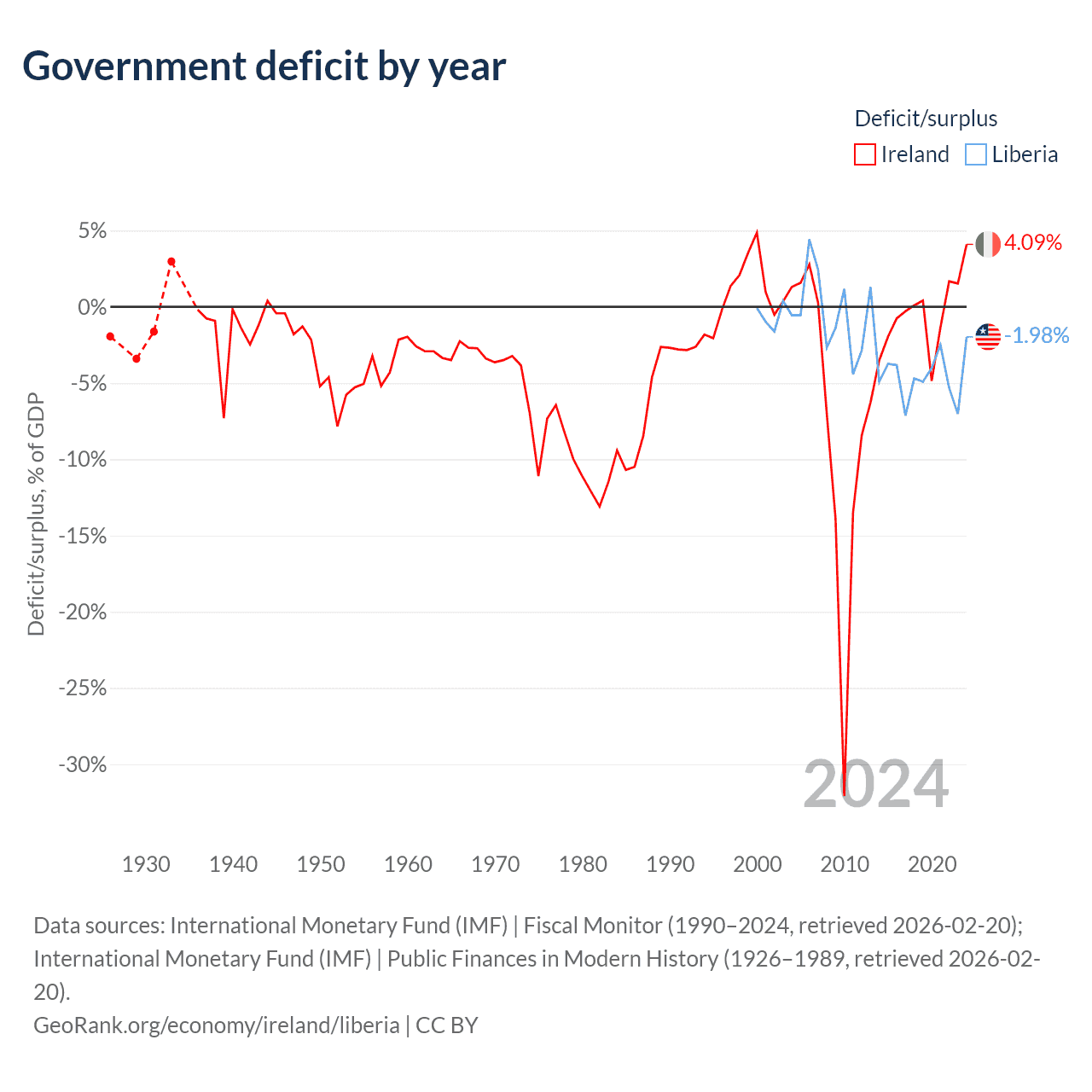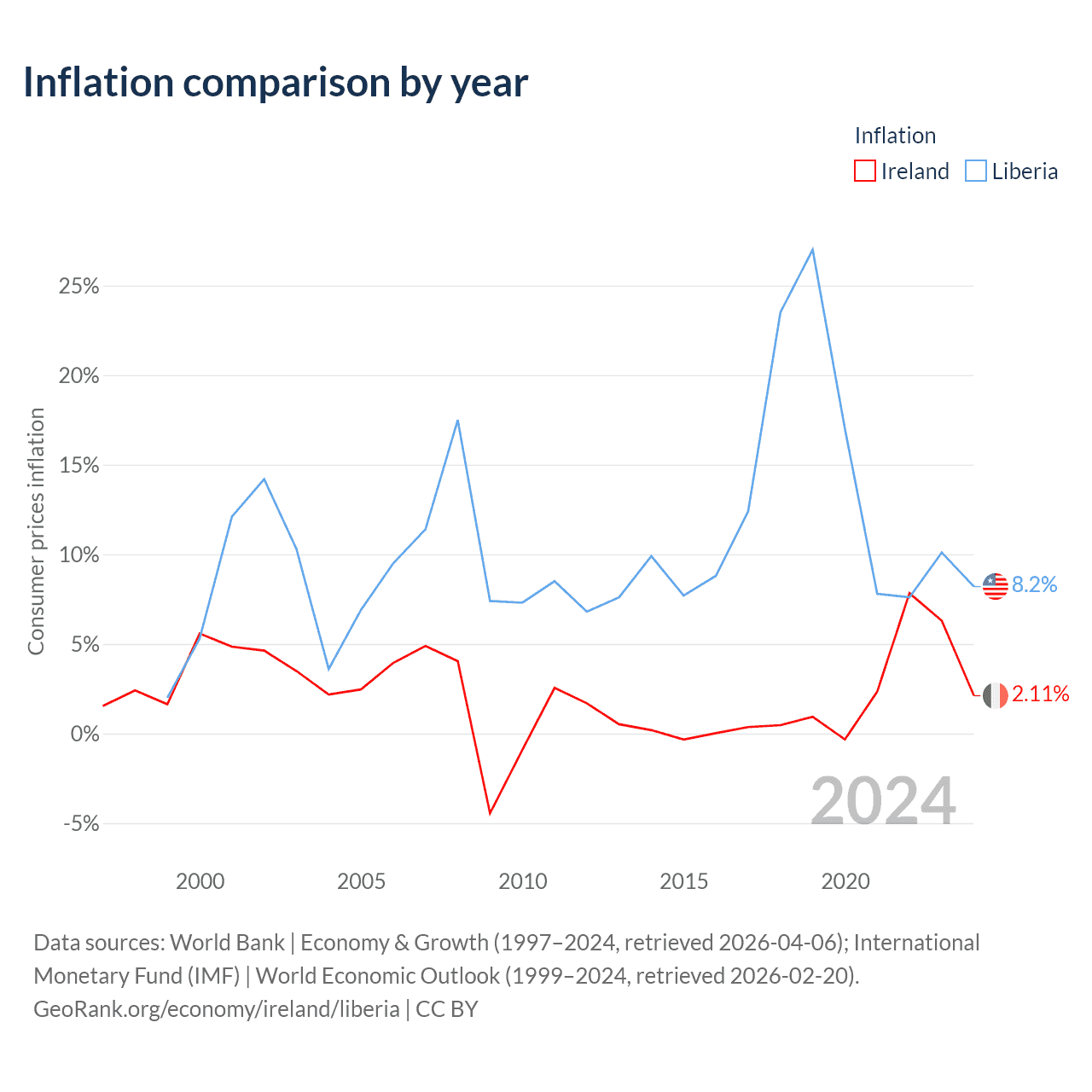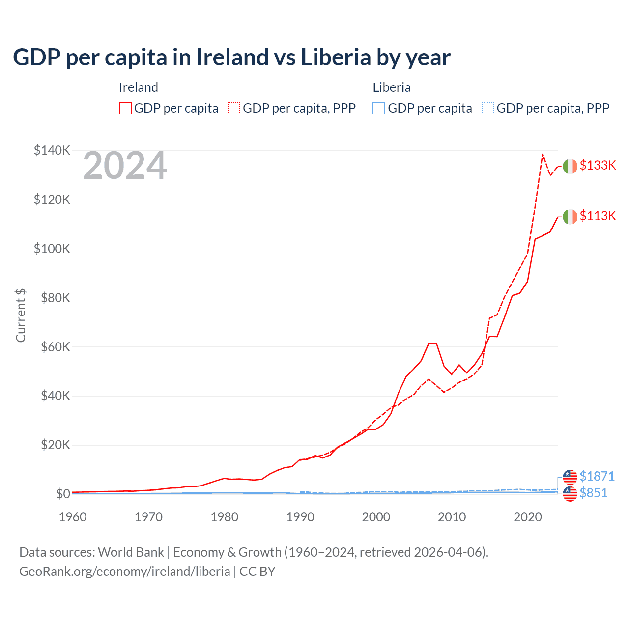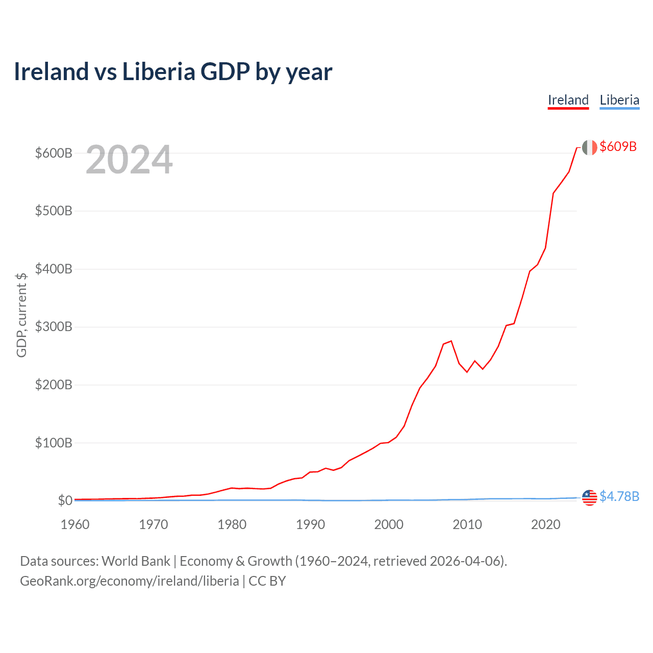 Ireland has a GDP of $609B compared to $4.78B for Liberia, ranking 25/197 and 163/197 by economy size, respectively.