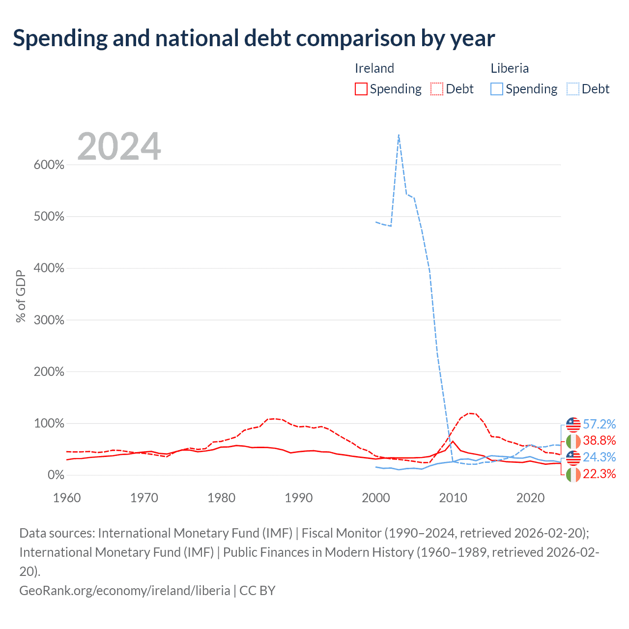 Ireland has $236B in government debt (38.8% of GDP), compared to $2.73B (57.2% of GDP) in Liberia.