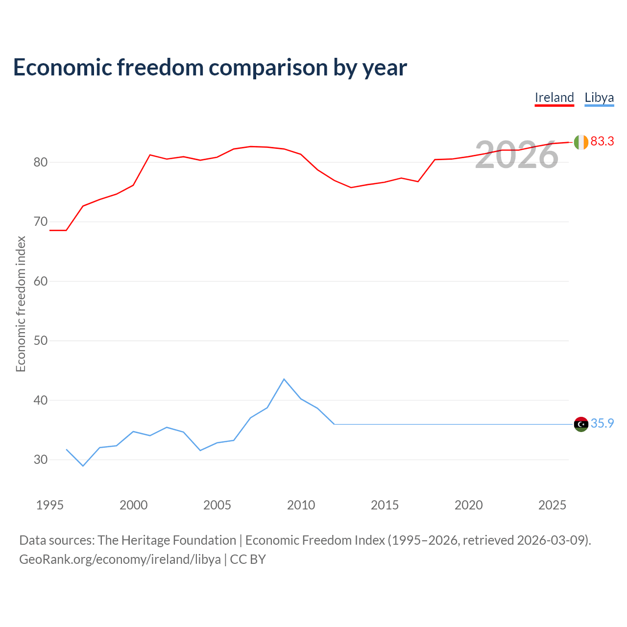 The Economic Freedom Index for Ireland is 83.3, ranking 3/197, compared to 35.9 for Libya, ranking 189/197. The chart above displays a comparison of annual changes in economic freedom indexes.