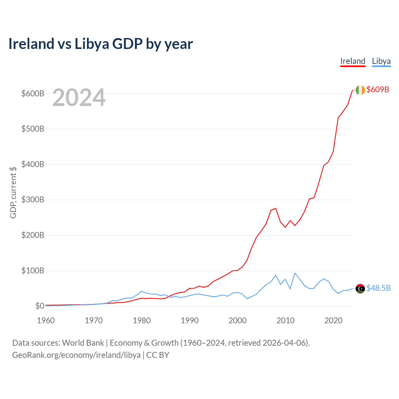 Ireland has a GDP of $609B compared to $48.5B for Libya, ranking 25/197 and 95/197 by economy size, respectively.
