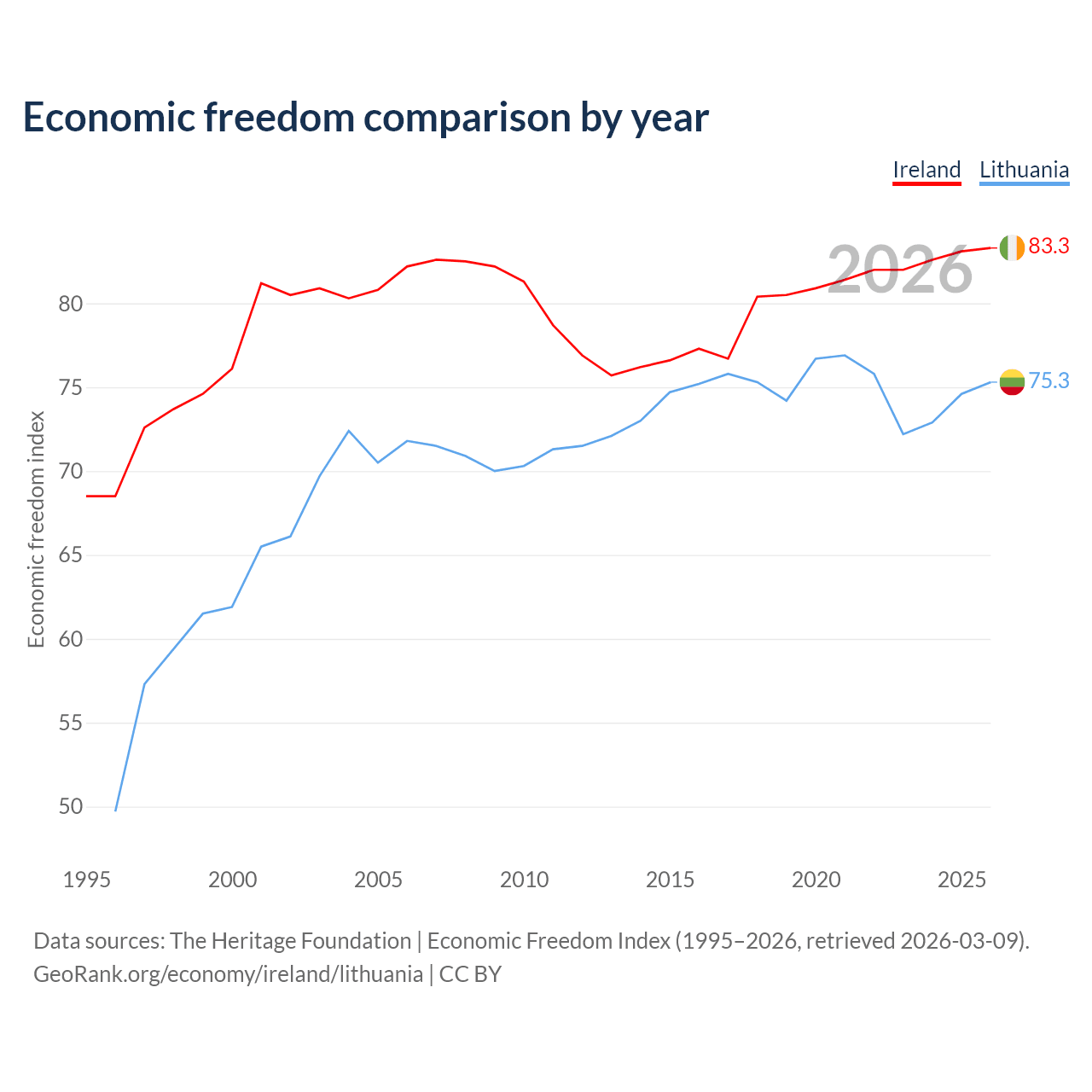 The Economic Freedom Index for Ireland is 83.3, ranking 3/197, compared to 75.3 for Lithuania, ranking 18/197. The chart above displays a comparison of annual changes in economic freedom indexes.