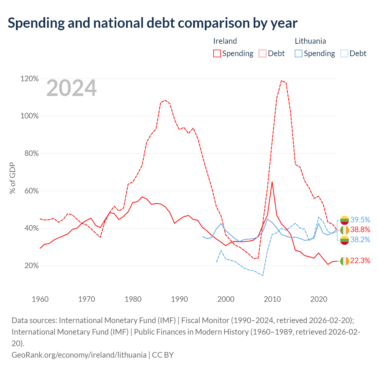 Ireland has $236B in government debt (38.8% of GDP), compared to $32.4B (38.2% of GDP) in Lithuania.