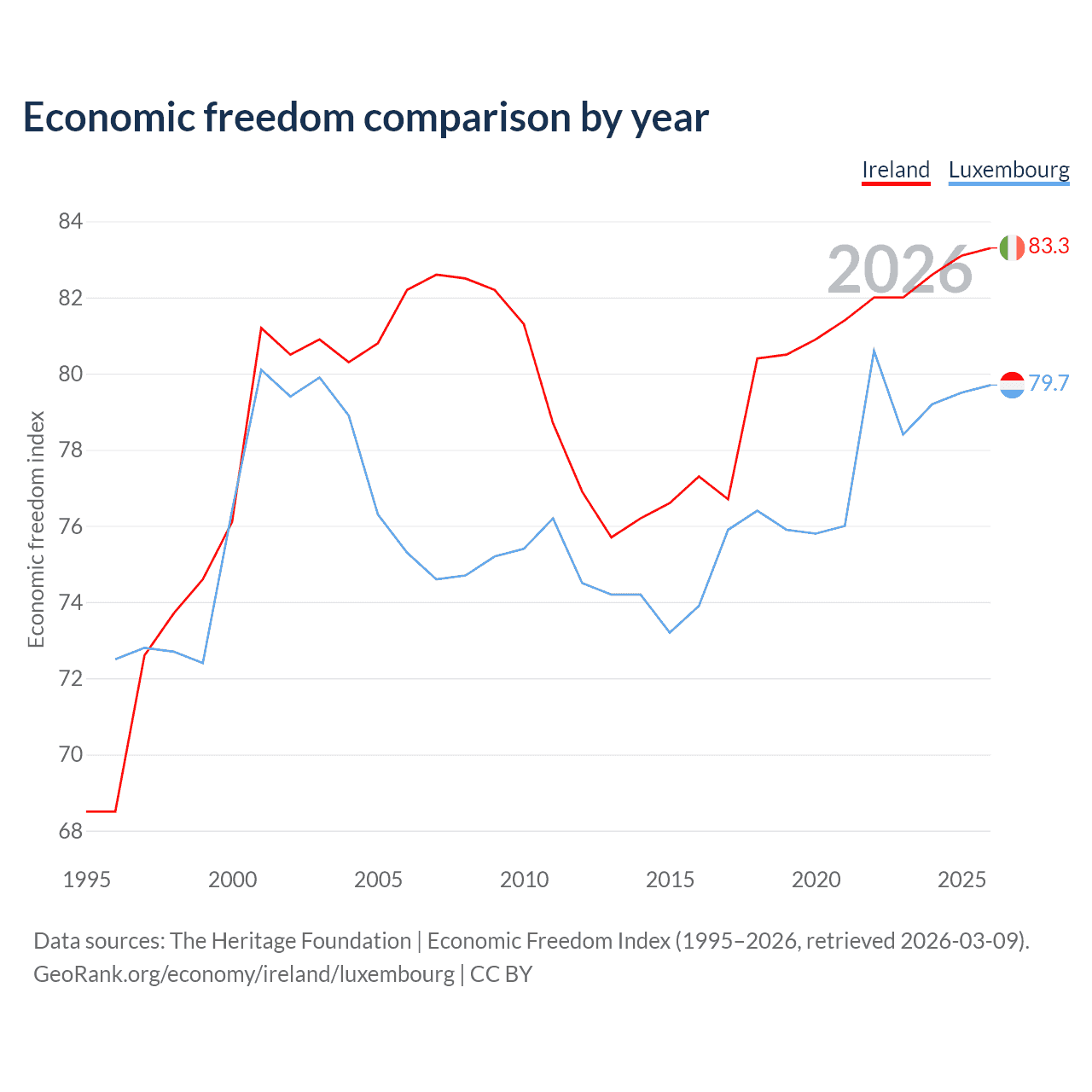 The Economic Freedom Index for Ireland is 83.3, ranking 3/197, compared to 79.7 for Luxembourg, ranking 7/197. The chart above displays a comparison of annual changes in economic freedom indexes.