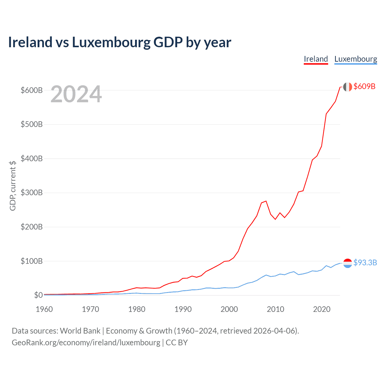 Ireland has a GDP of $609B compared to $93.3B for Luxembourg, ranking 25/197 and 74/197 by economy size, respectively.