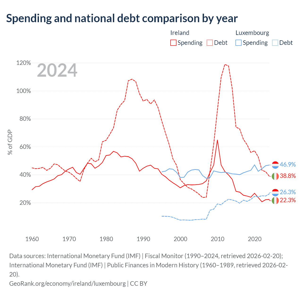 Ireland has $236B in government debt (38.8% of GDP), compared to $24.5B (26.3% of GDP) in Luxembourg.