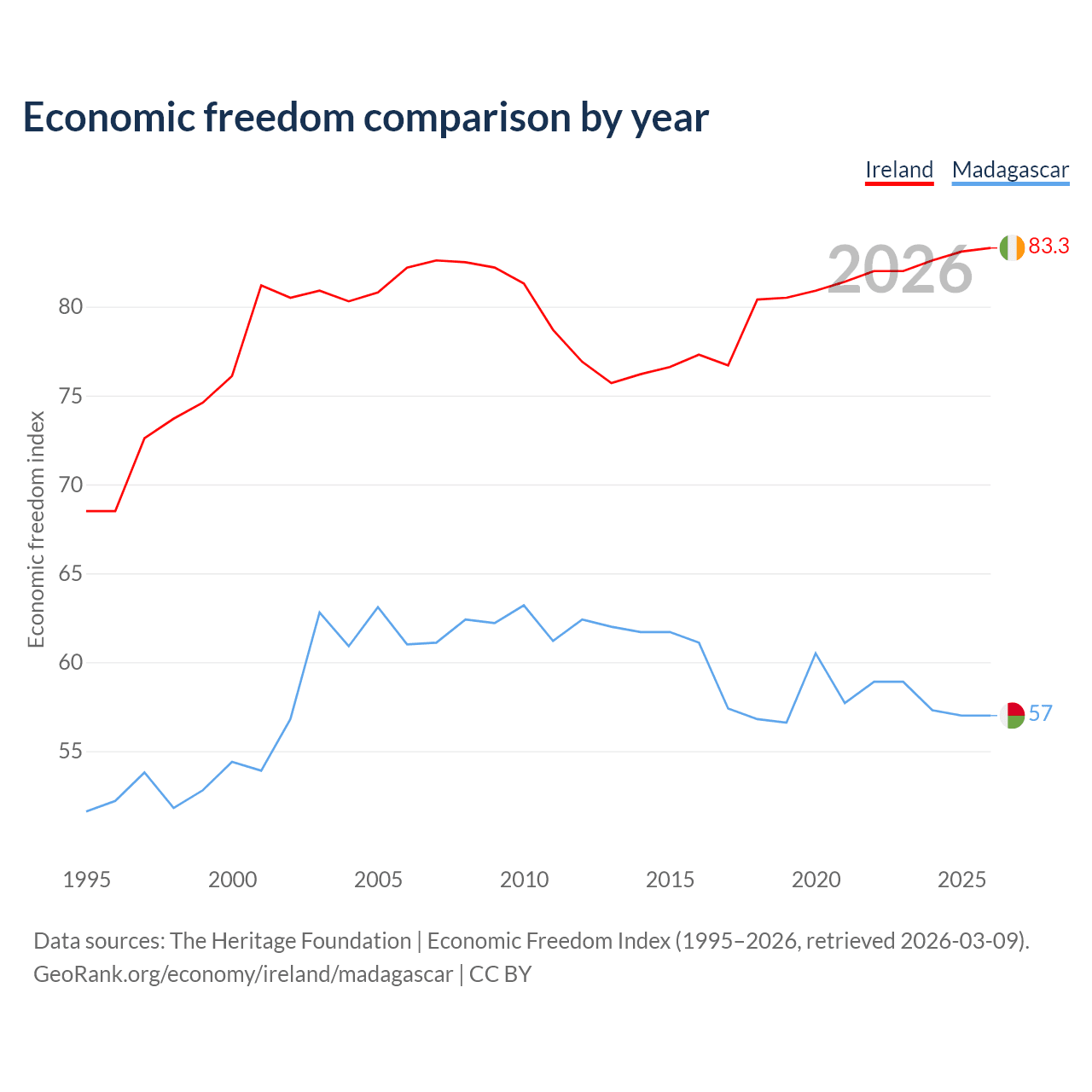 The Economic Freedom Index for Ireland is 83.3, ranking 3/197, compared to 57 for Madagascar, ranking 119/197. The chart above displays a comparison of annual changes in economic freedom indexes.