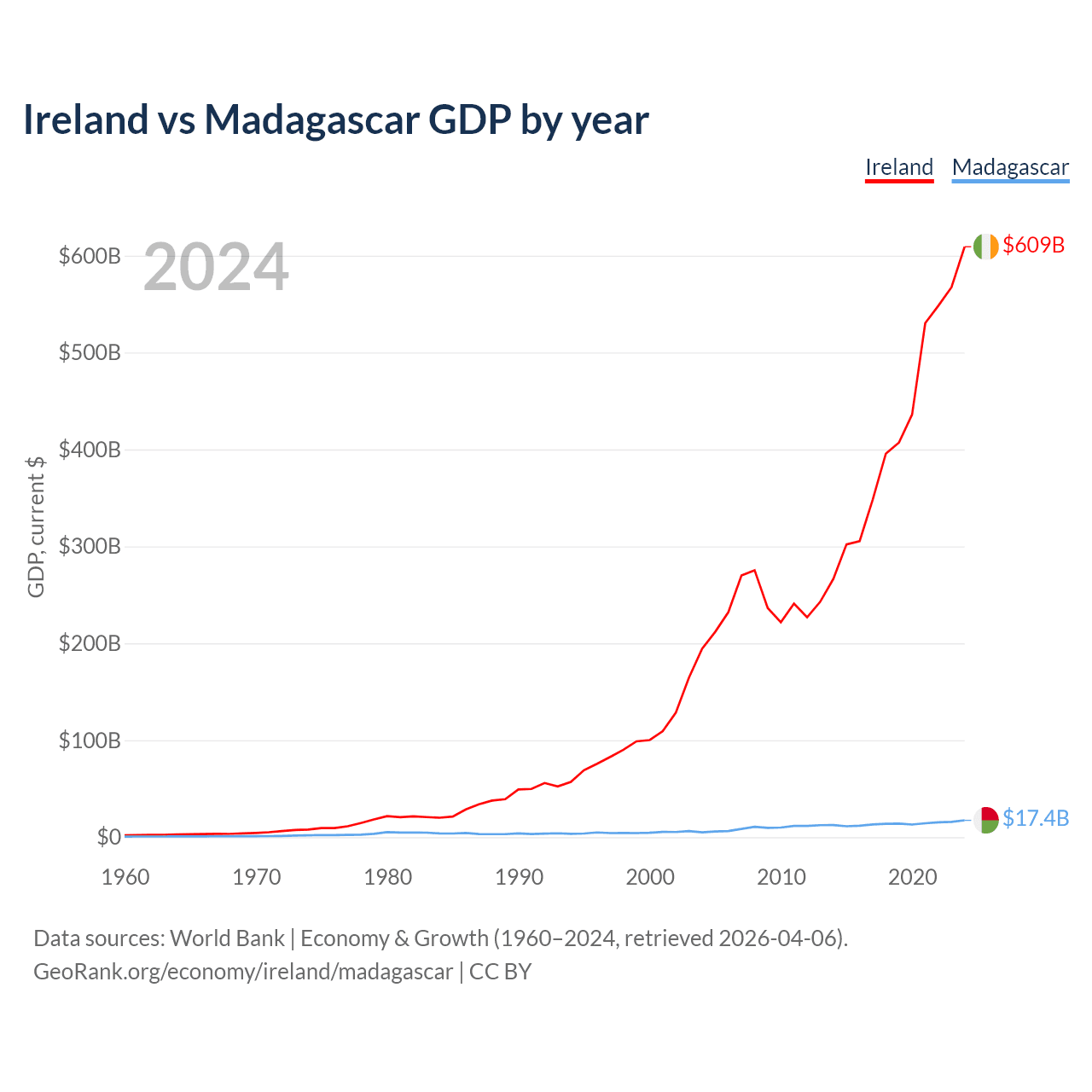 Ireland has a GDP of $609B compared to $17.4B for Madagascar, ranking 25/197 and 136/197 by economy size, respectively.