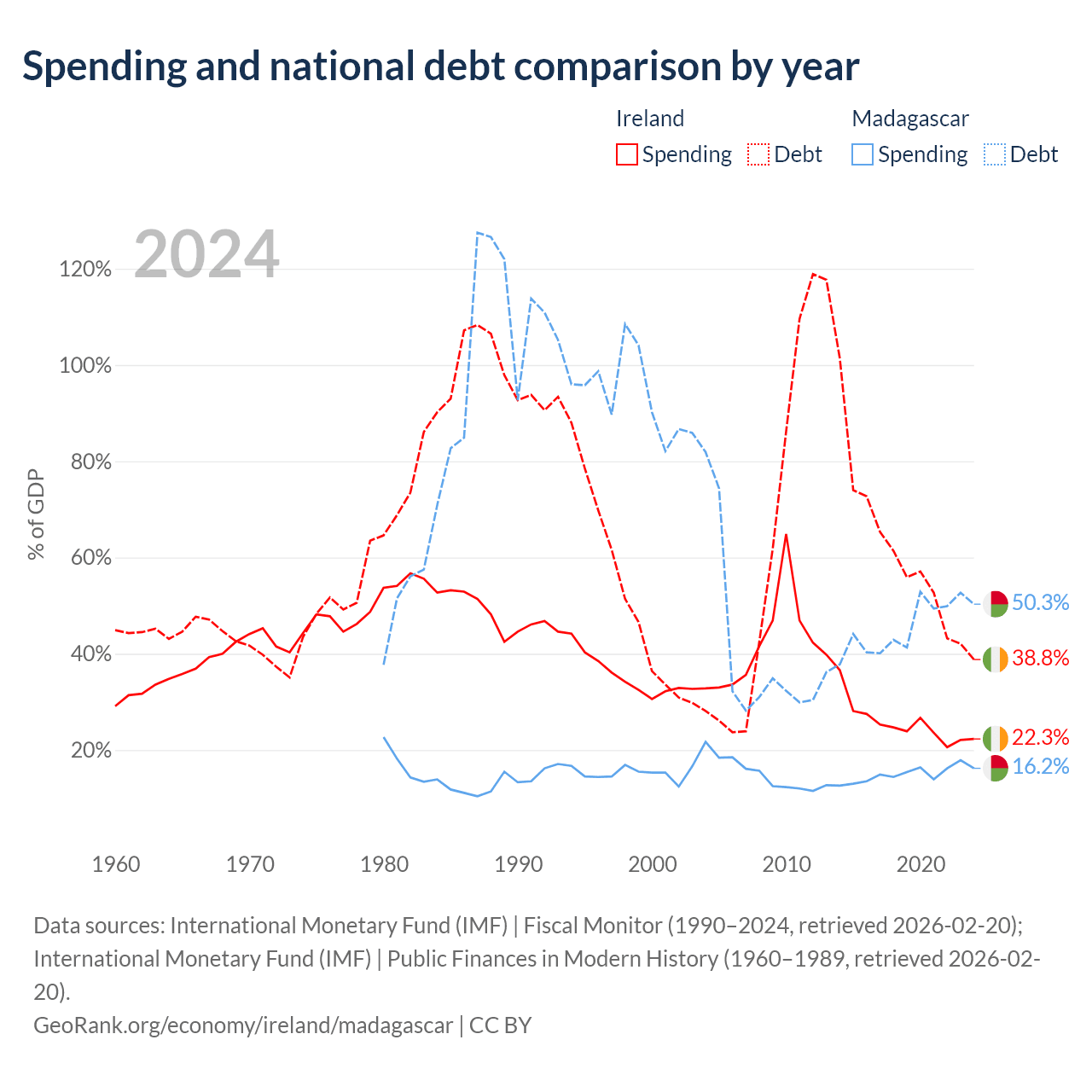 Ireland has $236B in government debt (38.8% of GDP), compared to $8.77B (50.3% of GDP) in Madagascar.