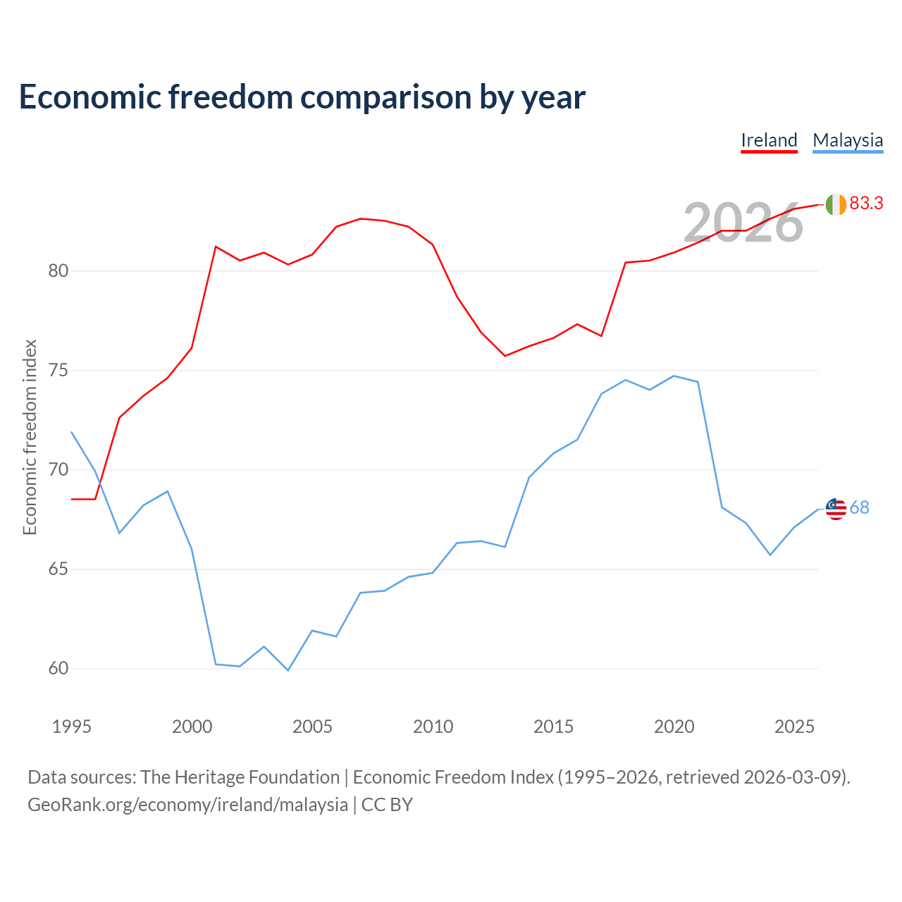The Economic Freedom Index for Ireland is 83.3, ranking 3/197, compared to 68 for Malaysia, ranking 51/197. The chart above displays a comparison of annual changes in economic freedom indexes.