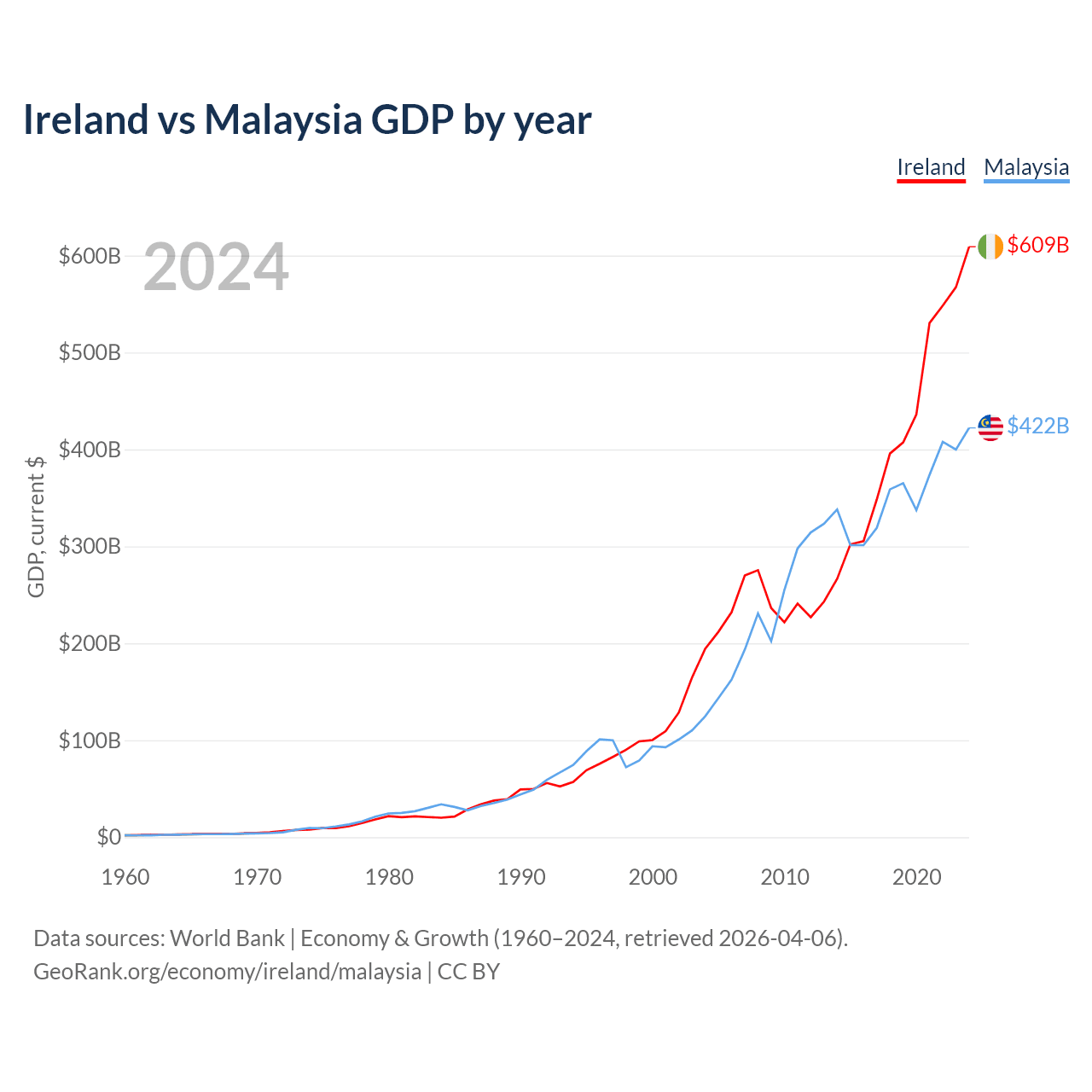 Ireland vs Malaysia GDP by year