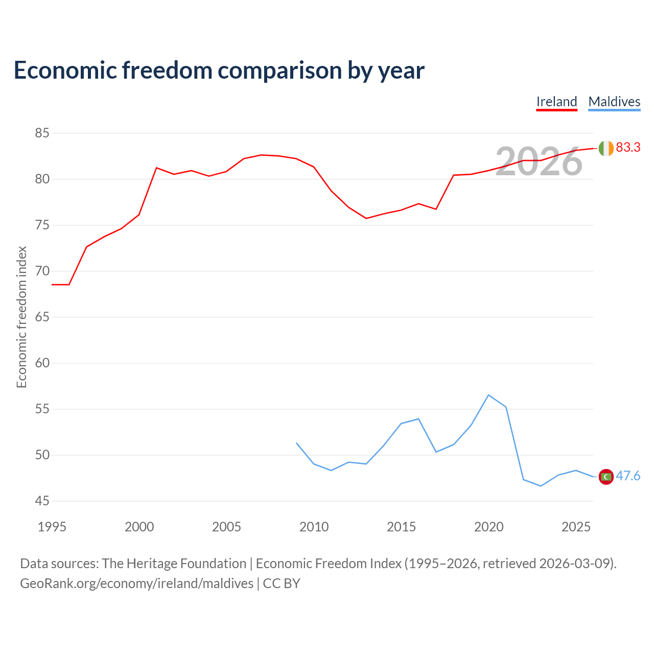 The Economic Freedom Index for Ireland is 83.3, ranking 3/197, compared to 47.6 for Maldives, ranking 174/197. The chart above displays a comparison of annual changes in economic freedom indexes.