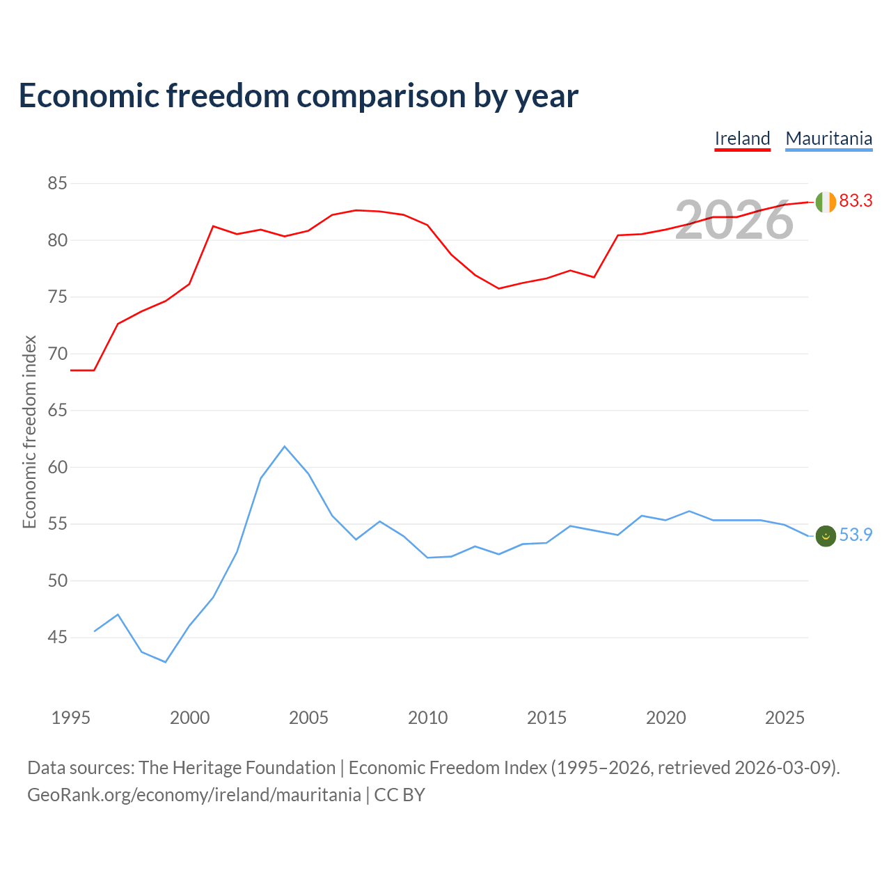 The Economic Freedom Index for Ireland is 83.3, ranking 3/197, compared to 53.9 for Mauritania, ranking 136/197. The chart above displays a comparison of annual changes in economic freedom indexes.