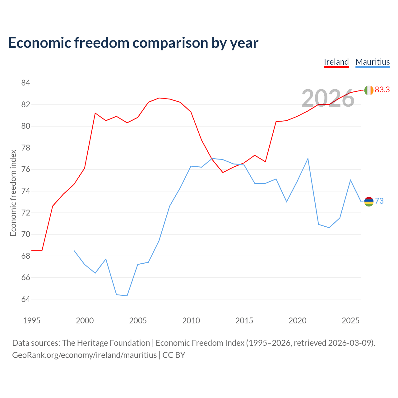 The Economic Freedom Index for Ireland is 83.3, ranking 3/197, compared to 73 for Mauritius, ranking 26/197. The chart above displays a comparison of annual changes in economic freedom indexes.