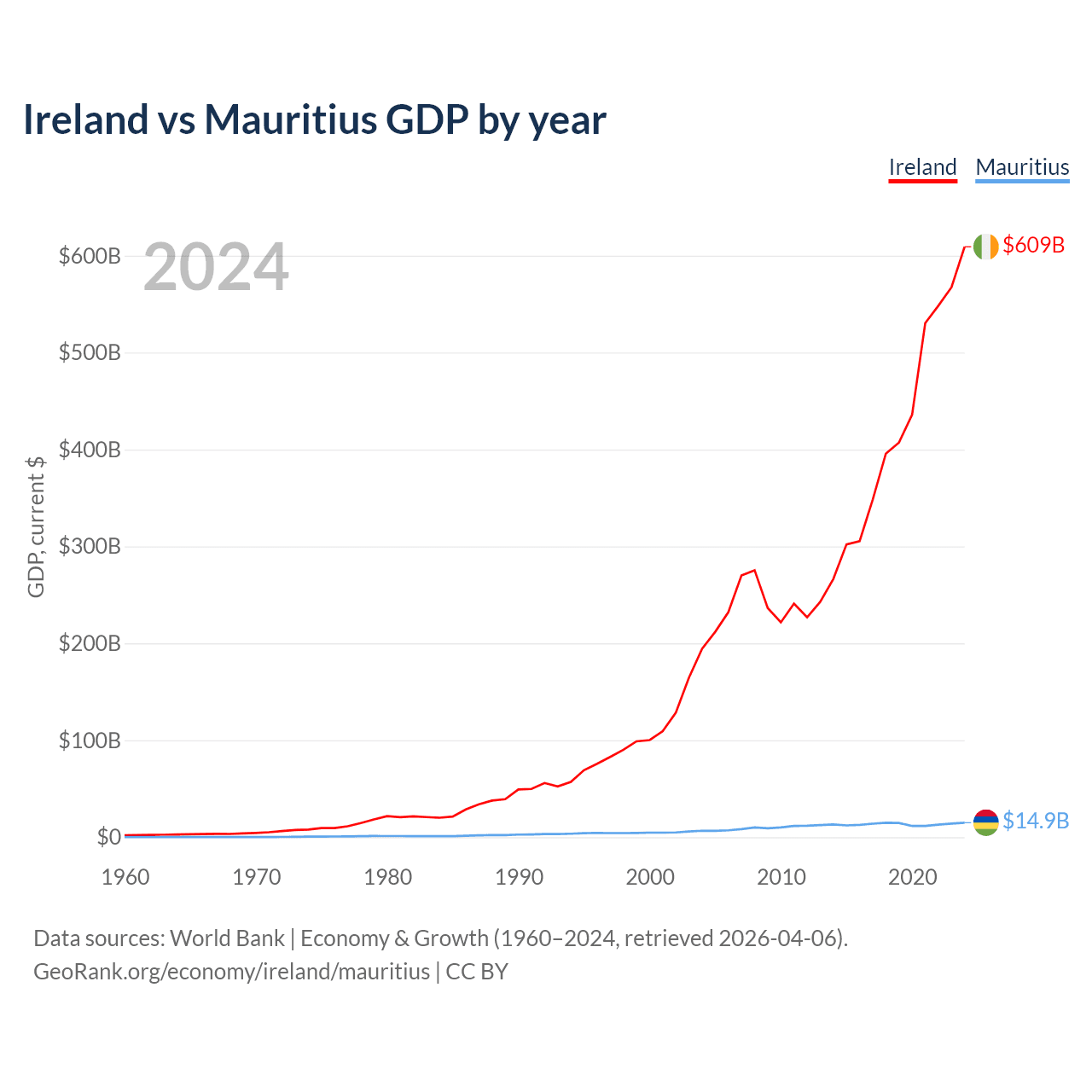Ireland has a GDP of $609B compared to $14.9B for Mauritius, ranking 25/197 and 143/197 by economy size, respectively.