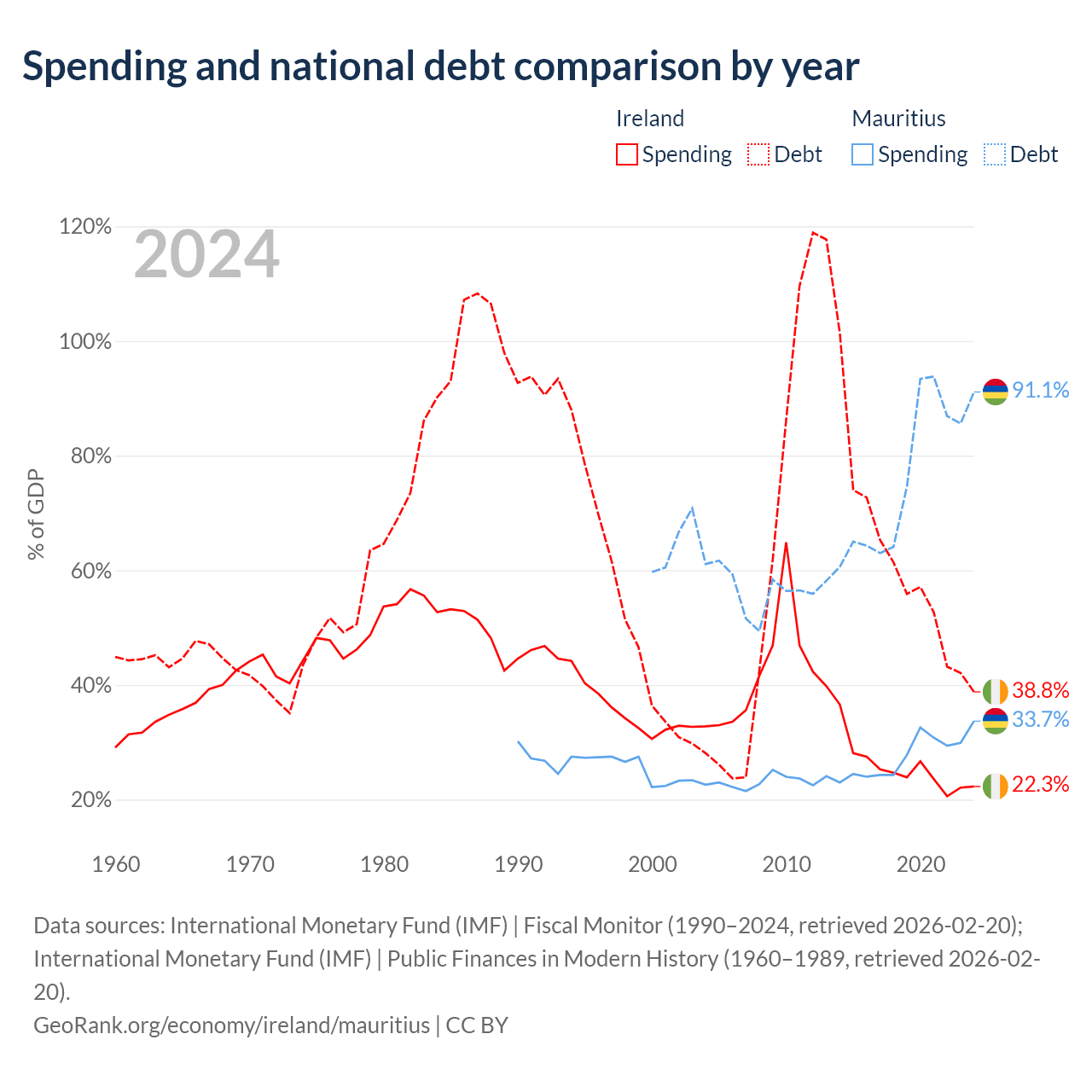 Ireland has $236B in government debt (38.8% of GDP), compared to $13.6B (91.1% of GDP) in Mauritius.