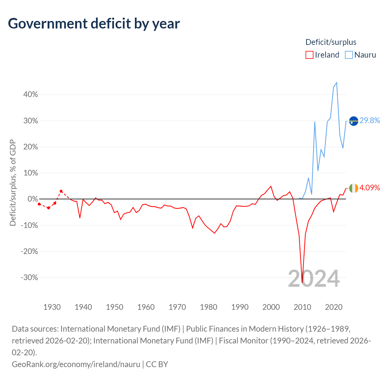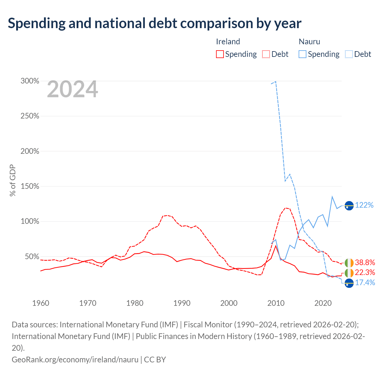 Ireland has $236B in government debt (38.8% of GDP), compared to $28.3M (17.4% of GDP) in Nauru.