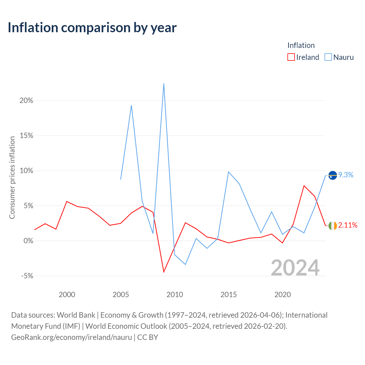 Over the past 20 years, Ireland has recorded an average annual inflation rate of 1.73%, compared with 4.84% in Nauru. In 2024, inflation was 2.11% in Ireland and 9.3% in Nauru.