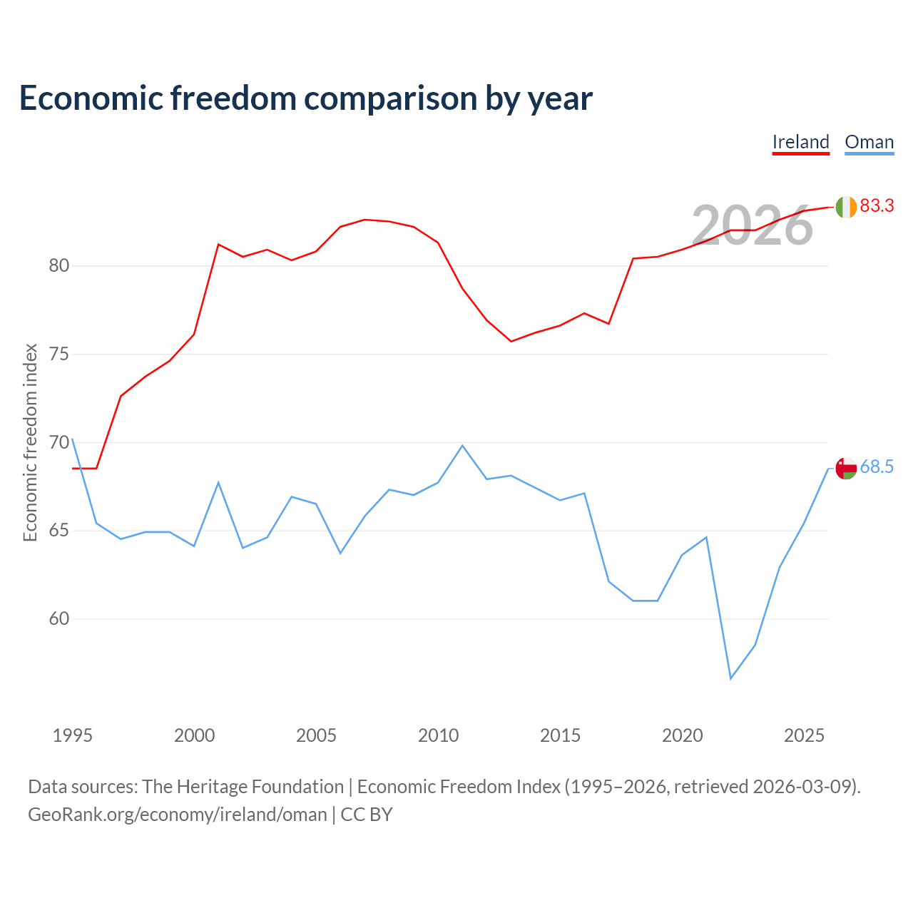 The Economic Freedom Index for Ireland is 83.3, ranking 3/197, compared to 68.5 for Oman, ranking 45/197. The chart above displays a comparison of annual changes in economic freedom indexes.