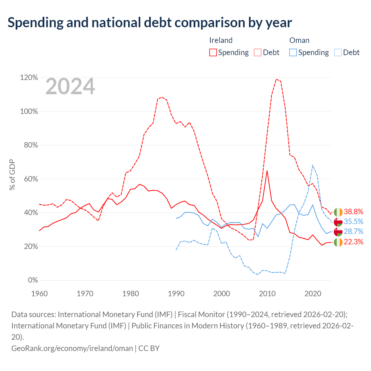 Ireland has $236B in government debt (38.8% of GDP), compared to $38B (35.5% of GDP) in Oman.