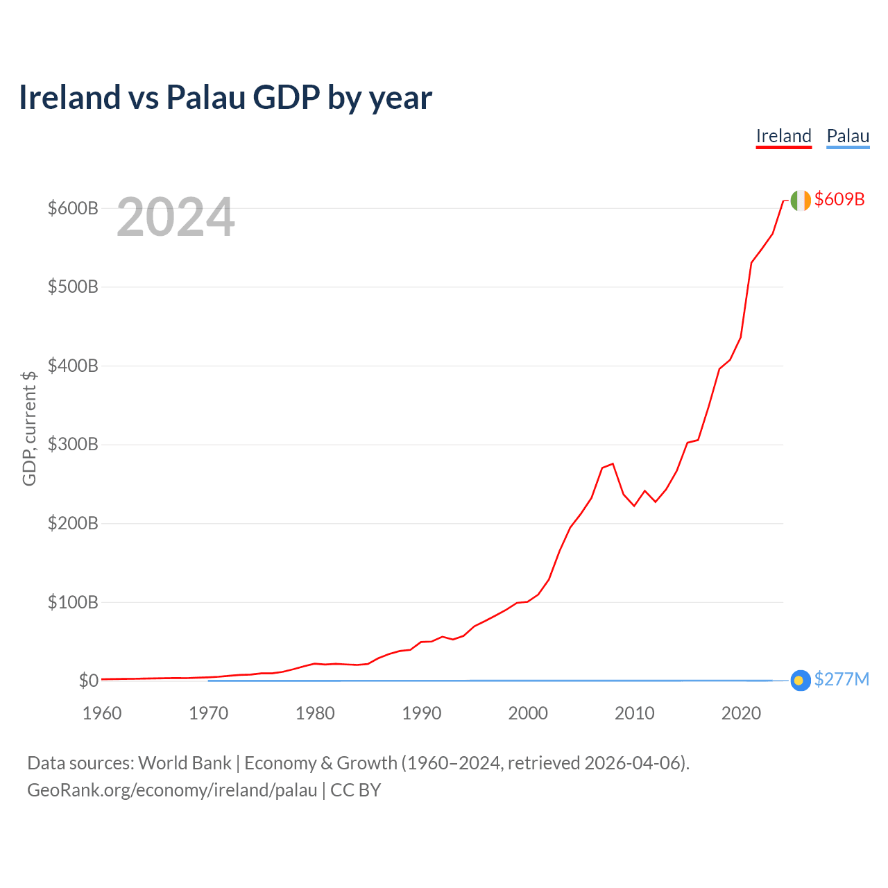 Ireland has a GDP of $609B compared to $277M for Palau, ranking 25/197 and 194/197 by economy size, respectively.